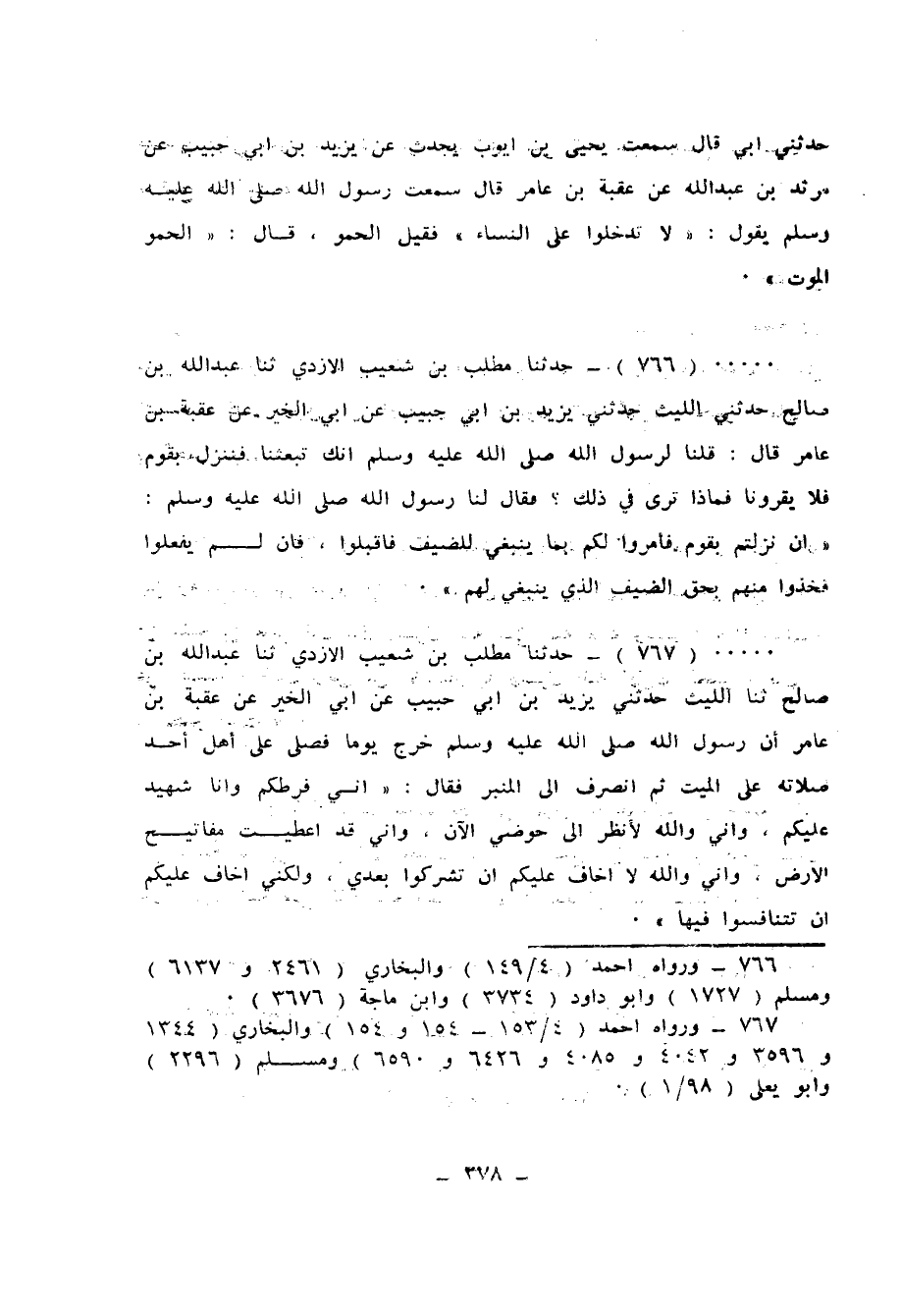 767 - حَدَّثَنَا مُطَّلِبُ بْنُ شُعَيْبٍ الْأَزْدِيُّ، ثَنَا عَبْدُ اللهِ بْنُ صَالِحٍ، ثَنَا اللَّيْثُ، حَدَّثَنِي يَزِيدُ بْنُ أَبِي حَبِيبٍ، عَنْ أَبِي الْخَيْرِ، عَنْ عُقْبَةَ بْنِ عَامِرٍ، أَنَّ رَسُولَ اللهِ صَلَّى اللهُ عَلَيْهِ وَسَلَّمَ خَرَجَ يَوْمًا فَصَلَّى عَلَى أَهْلِ أُحُدٍ صَلَاتَهُ عَلَى الْمَيِّتِ، ثُمَّ انْصَرَفَ إِلَى الْمِنْبَرِ فَقَالَ: «§إِنِّي فَرَطُكُمْ وَأَنَا شَهِيدٌ عَلَيْكُمْ، وَإِنِّي وَاللهِ لَأَنْظُرُ إِلَى حَوْضِي الْآنَ، وَإِنِّي قَدْ أُعْطِيتُ مَفَاتِيحَ الْأَرْضِ، وَإِنِّي وَاللهِ لَا أَخَافُ عَلَيْكُمْ أَنْ تُشْرِكُوا بَعْدِي، وَلَكِنِّي أَخَافُ عَلَيْكُمْ أَنْ تَتَنَافَسُوا فِيهَا»