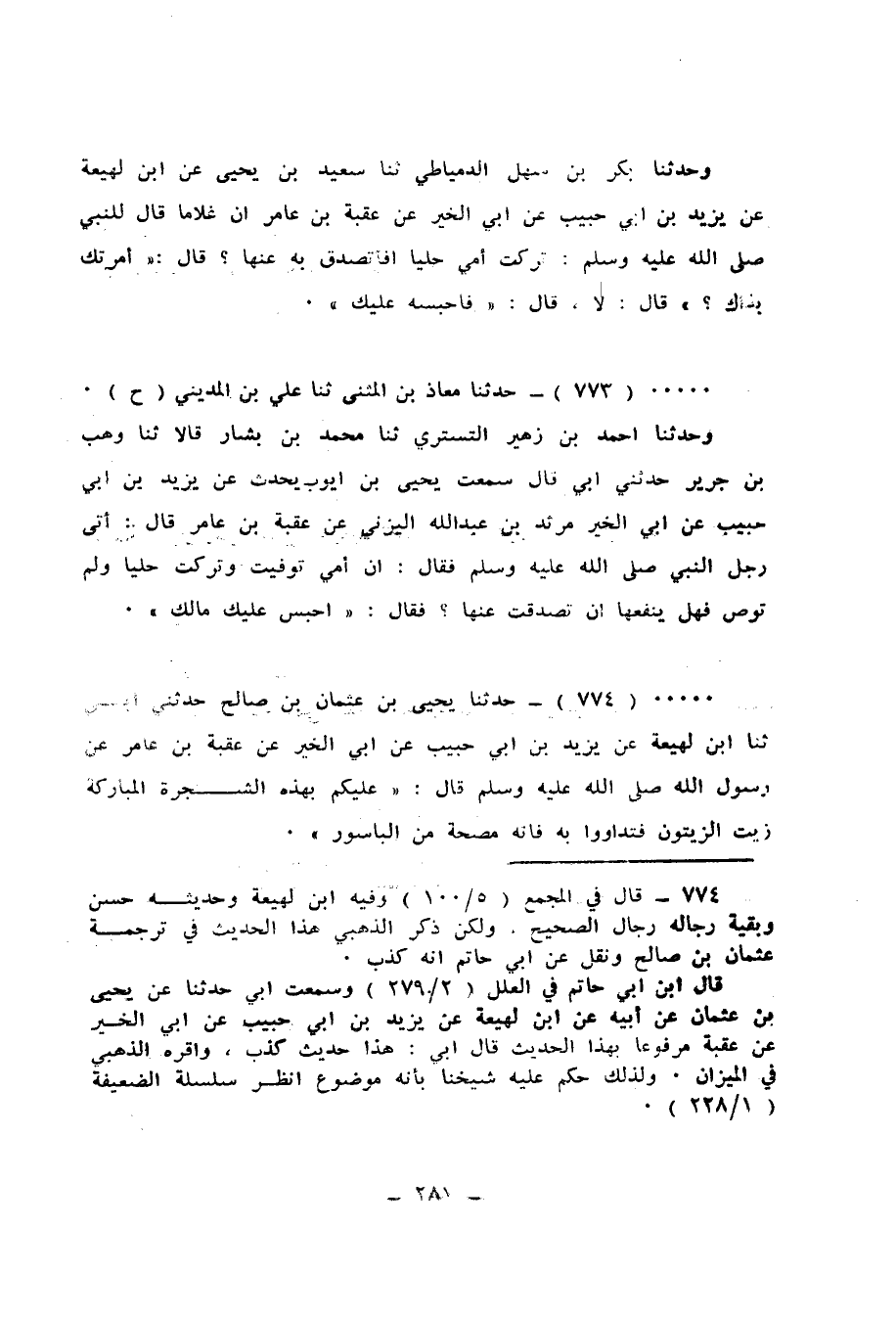 774 - حَدَّثَنَا يَحْيَى بْنُ عُثْمَانَ بْنِ صَالِحٍ، حَدَّثَنِي أَبِي، ثَنَا ابْنُ لَهِيعَةَ، عَنْ يَزِيدَ بْنِ أَبِي حَبِيبٍ، عَنْ أَبِي الْخَيْرِ، عَنْ عُقْبَةَ بْنِ عَامِرٍ، عَنْ رَسُولِ اللهِ صَلَّى اللهُ عَلَيْهِ وَسَلَّمَ قَالَ: «§عَلَيْكُمْ بِهَذِهِ الشَّجَرَةِ الْمُبَارَكَةِ زَيْتِ الزَّيْتُونِ، فَتَدَاوَوْا بِهِ فَإِنَّهُ مَصَحَّةٌ مِنَ الْبَاسُورِ»