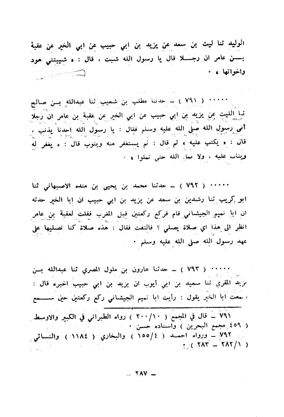 793 - حَدَّثَنَا هَارُونُ بْنُ ملولٍ الْمِصْرِيُّ، ثَنَا عَبْدُ اللهِ بْنُ يَزِيدَ الْمُقْرِئُ، ثَنَا سَعِيدُ بْنُ أَبِي أَيُّوبَ، أَنَّ يَزِيدَ بْنَ أَبِي حَبِيبٍ أَخْبَرَهُ قَالَ: سَمِعْتُ أَبَا الْخَيْرِ يَقُولُ: رَأَيْتُ أَبَا تَمِيمٍ الْجَيْشَانِيَّ §رَكَعَ رَكْعَتَيْنِ حِينَ سَمِعَ آذَانَ الْمَغْرِبِ قَبْلَ الصَّلَاةَ، فَجِئْتُ وَأَنَا أُرِيدُ أَنْ أَمْنَعَهُ، فَقَالَ عُقْبَةُ بْنُ عَامِرٍ: «إِنَّا كُنَّا نَفْعَلُهُ عَلَى عَهْدِ رَسُولِ اللهِ صَلَّى اللهُ عَلَيْهِ وَسَلَّمَ»