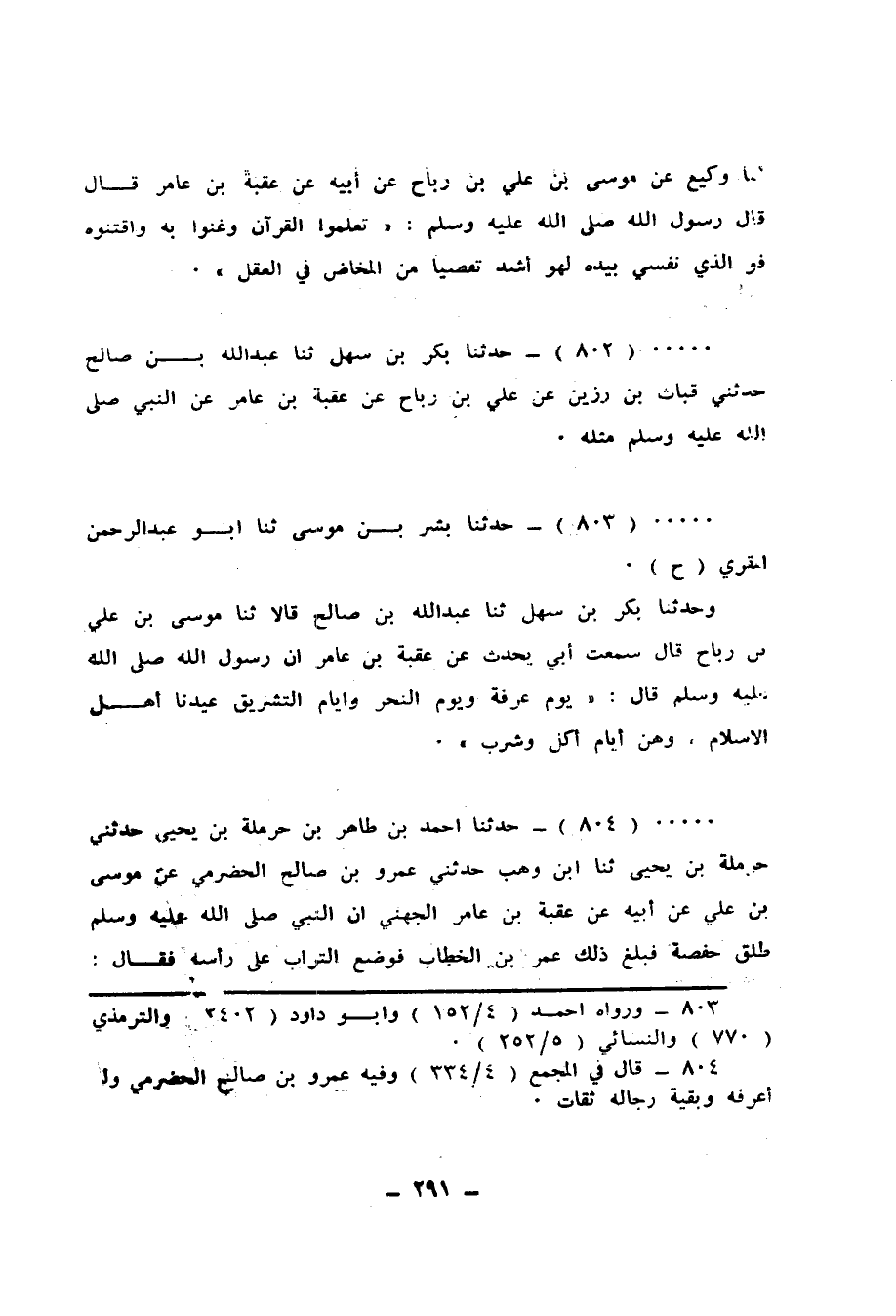 803 - حَدَّثَنَا بِشْرُ بْنُ مُوسَى، ثَنَا أَبُو عَبْدِ الرَّحْمَنِ الْمُقْرِئُ، ح، وَحَدَّثَنَا بَكْرُ بْنُ سَهْلٍ، ثَنَا عَبْدُ اللهِ بْنُ صَالِحٍ قَالَا: ثَنَا مُوسَى بْنُ عَلِيِّ بْنِ رَبَاحٍ قَالَ: سَمِعْتُ أَبِي يُحَدِّثُ، عَنْ عُقْبَةَ بْنِ عَامِرٍ، أَنَّ رَسُولَ اللهِ صَلَّى اللهُ عَلَيْهِ وَسَلَّمَ قَالَ: «§يَوْمُ عَرَفَةَ وَيَوْمُ النَّحْرِ وَأَيَّامُ التَّشْرِيقِ عِيدُنَا أَهْلَ الْإِسْلَامِ وَهُنَّ أَيَّامُ أَكْلٍ وَشُرْبٍ»