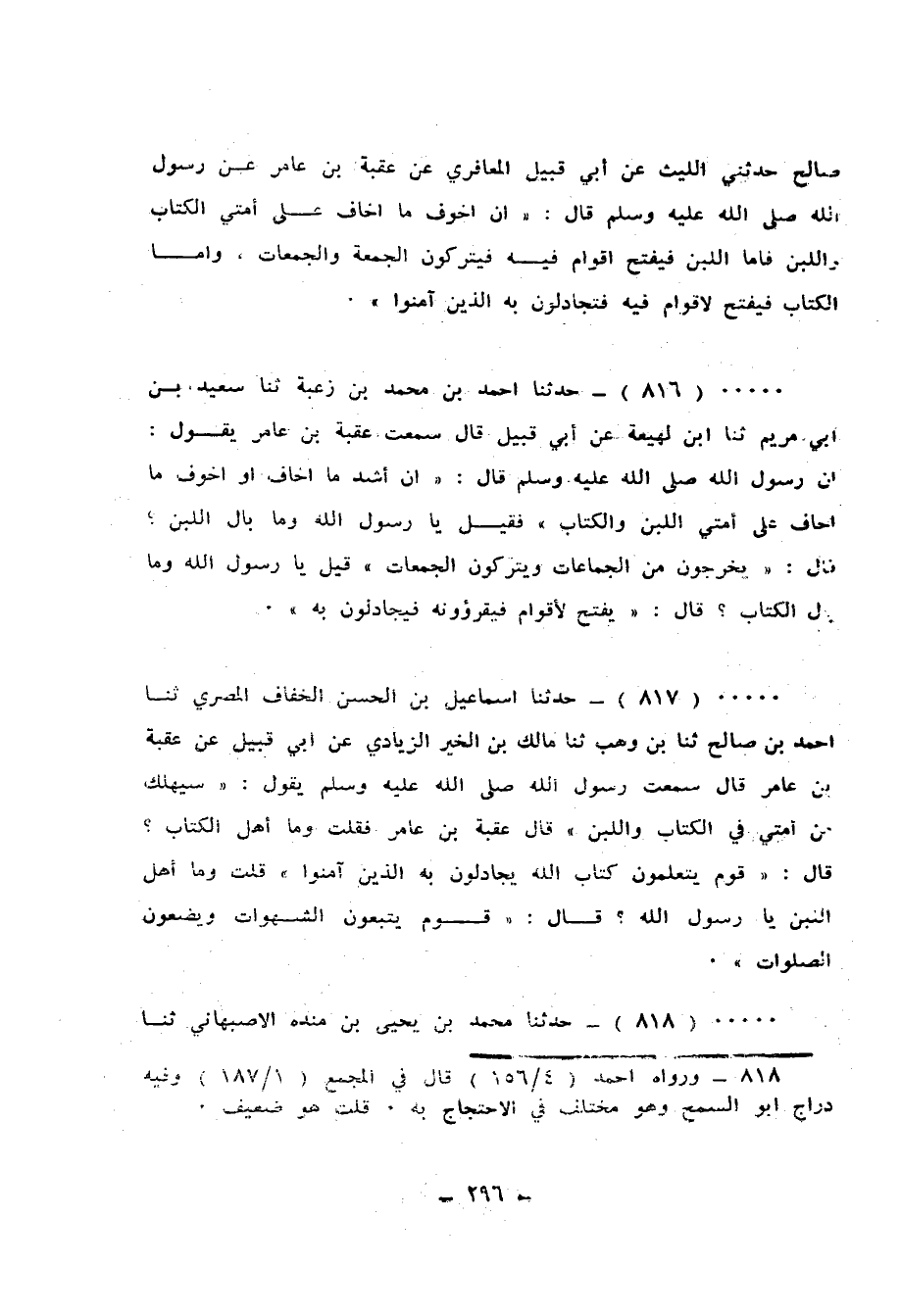 816 - حَدَّثَنَا أَحْمَدُ بْنُ حَمَّادِ بْنِ زُغْبَةَ، ثَنَا سَعِيدُ بْنُ أَبِي مَرْيَمَ، ثَنَا ابْنُ لَهِيعَةَ، عَنْ أَبِي قَبِيلٍٍ قَالَ: سَمِعْتُ عُقْبَةَ بْنَ عَامِرٍ، يَقُولُ: إِنَّ رَسُولَ اللهِ صَلَّى اللهُ عَلَيْهِ وَسَلَّمَ قَالَ: «إِنَّ §أَشَدَّ مَا أَخَافُ أَوْ أَخْوَفَ مَا أَخَافُ عَلَى أُمَّتِي اللَّبَنُ وَالْكِتَابُ» فَقِيلَ: يَا رَسُولَ اللهِ، وَمَا بَالُ اللَّبَنِ؟ قَالَ: «يَخْرُجُونَ مِنَ الْجَمَاعَاتِ وَيَتْرُكُونَ الْجُمُعَاتِ» قِيلَ: يَا رَسُولَ اللهِ، وَمَا بَالُ الْكِتَابِ؟ قَالَ: «يُفْتَحُ لِأَقْوَامٍ فَيَقْرَءُونَهُ فَيُجَادِلُونَ بِهِ»
