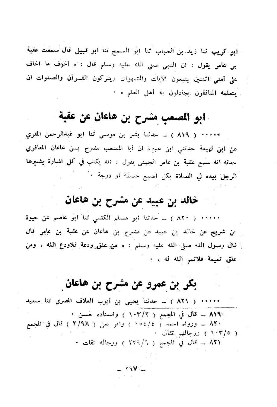 821 - حَدَّثَنَا يَحْيَى بْنُ أَيُّوبَ الْعَلَّافُ الْمِصْرِيُّ، ثَنَا سَعِيدُ بْنُ أَبِي مَرْيَمَ، أَنَا نَافِعُ بْنُ يَزِيدَ، حَدَّثَنِي بَكْرُ بْنُ عَمْرٍو، أَنَّهُ سَمِعَ مِشْرَحَ بْنَ هَاعَانَ يَقُولُ: سَمِعْتُ عُقْبَةَ بْنَ عَامِرٍ يَقُولُ: قَالَ رَسُولُ اللهِ صَلَّى اللهُ عَلَيْهِ وَسَلَّمَ: «§سَيَخْرُجُ أَقْوَامٌ مِنْ أُمَّتِي يَشْرَبُونَ الْقُرْآنَ كُشُرْبِهِمُ اللَّبَنَ»