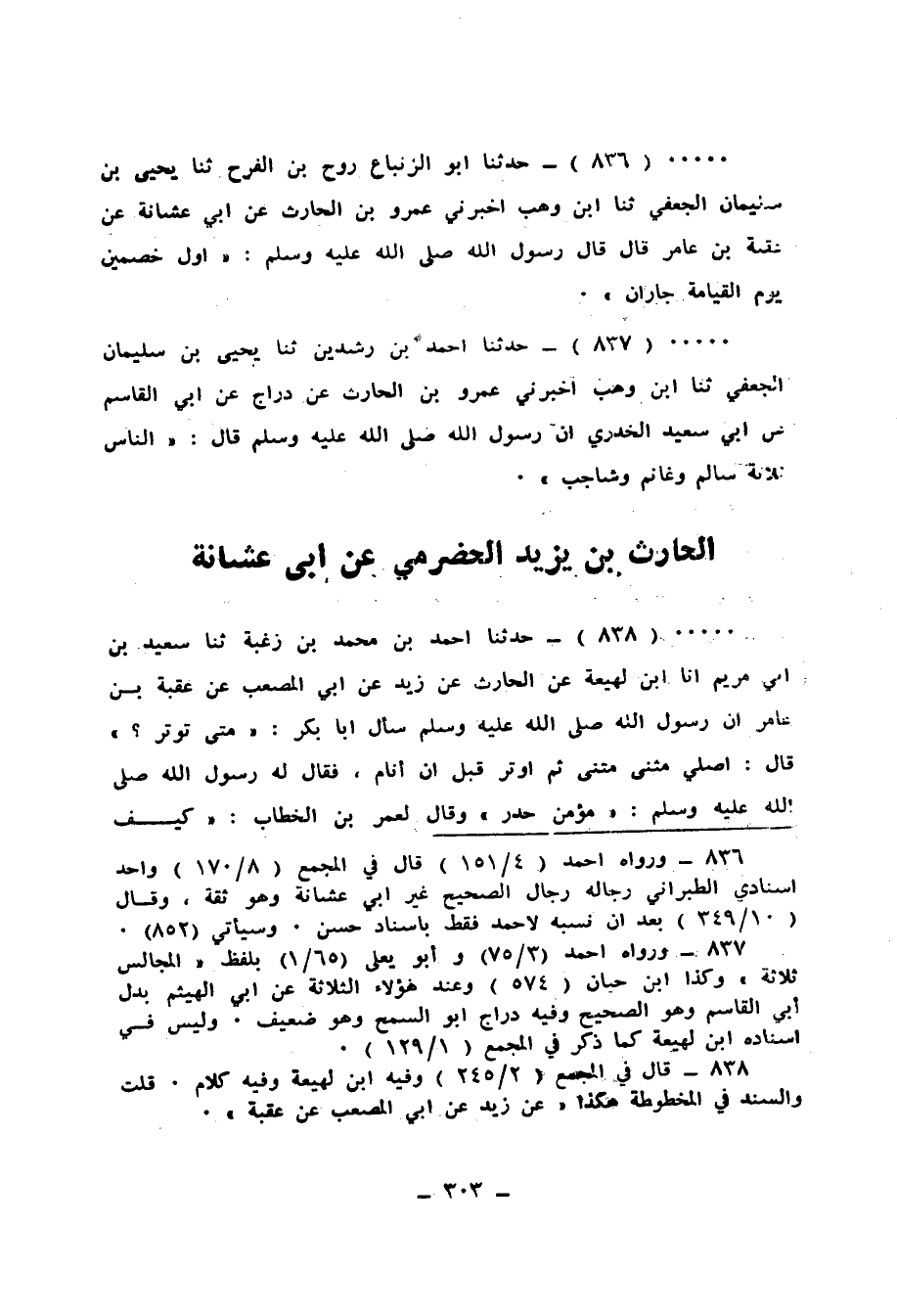 838 - حَدَّثَنَا أَحْمَدُ بْنُ حَمَّادِ بْنِ زُغْبَةَ، ثَنَا سَعِيدُ بْنُ أَبِي مَرْيَمَ، أَنَا ابْنُ لَهِيعَةَ، عَنِ الْحَارِثِ بْنِ يَزِيدٍ، عَنْ أَبِي الْمُصْعَبِ، عَنْ عُقْبَةَ بْنِ عَامِرٍ، أَنَّ رَسُولَ اللهِ صَلَّى اللهُ عَلَيْهِ وَسَلَّمَ سَأَلَ أَبَا بَكْرٍ «§مَتَى تُوتِرُ؟» قَالَ: أُصَلِّي مَثْنَى مَثْنَى، ثُمَّ أُوتِرُ قَبْلَ أنْ أَنَامَ، فَقَالَ لَهُ رَسُولُ اللهِ صَلَّى اللهُ عَلَيْهِ وَسَلَّمَ: «مُؤْمِنٌ حَذِرٌ» وَقَالَ لِعُمَرَ بْنِ الْخَطَّابِ: «كَيْفَ تُوتِرُ؟» قَالَ: أُصَلِّي مَثْنَى مَثْنَى، ثُمَّ أَنَامُ حَتَّى أُوتِرَ مِنْ آخِرِ اللَّيْلِ، فَقَالَ النَّبِيُّ صَلَّى اللهُ عَلَيْهِ وَسَلَّمَ: «مُؤْمِنٌ قَوِيٌّ»