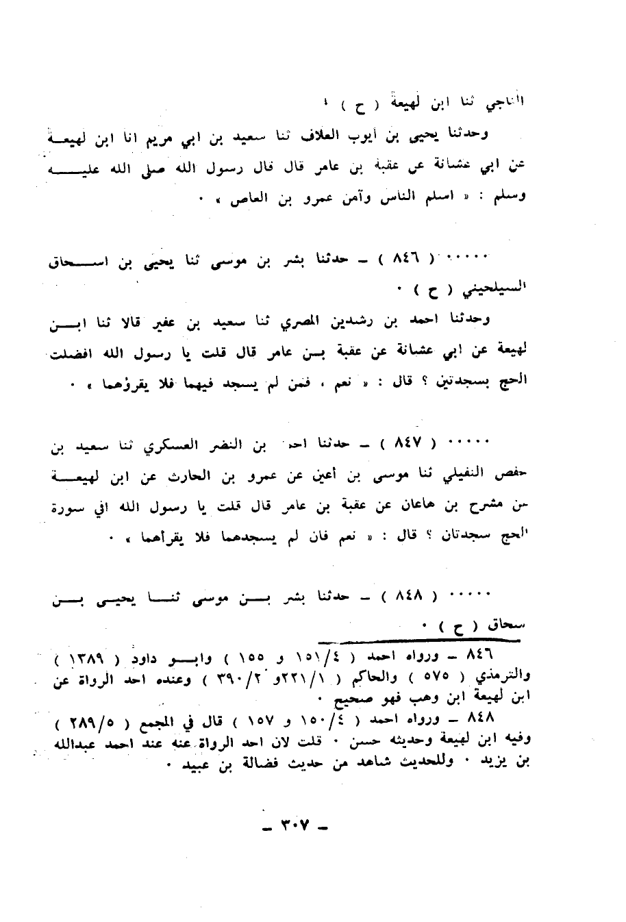 846 - حَدَّثَنَا بِشْرُ بْنُ مُوسَى، ثَنَا يَحْيَى بْنُ إِسْحَاقَ السَّيْلَحِينِيُّ، ح، وَحَدَّثَنَا أَحْمَدُ بْنُ رِشْدِينَ الْمِصْرِيُّ، ثَنَا سَعِيدُ بْنُ عُفَيْرٍ قَالَا: ثَنَا ابْنُ لَهِيعَةَ، عَنْ أَبِي عُشَّانَةَ، عَنْ عُقْبَةَ بْنِ عَامِرٍ قَالَ: قُلْتُ: يَا رَسُولَ اللهِ، أَفُضِّلَتِ الْحَجُّ بِسَجْدَتَيْنِ؟ قَالَ: «نَعَمْ، §فَمَنْ لَمْ يَسْجُدْ فِيهِمَا فَلَا يَقْرَأْهُمَا»