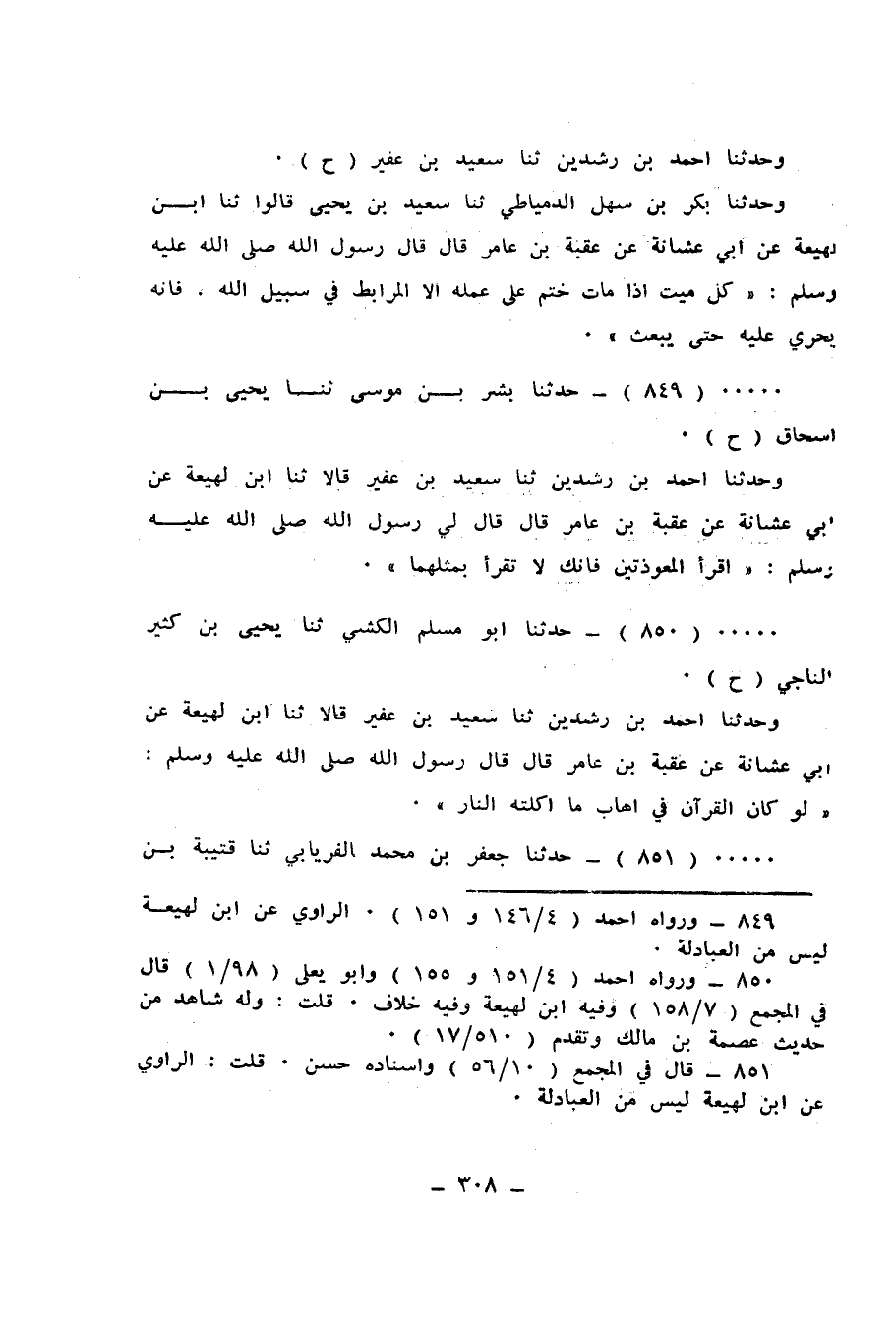 849 - حَدَّثَنَا بِشْرُ بْنُ مُوسَى، ثَنَا يَحْيَى بْنُ إِسْحَاقَ، ح، وَحَدَّثَنَا أَحْمَدُ بْنُ رِشْدِينَ، ثَنَا سَعِيدُ بْنُ عُفَيْرٍ قَالَا: ثَنَا ابْنُ لَهِيعَةَ، عَنْ أَبِي عُشَّانَةَ، عَنْ عُقْبَةَ بْنِ عَامِرٍ قَالَ: قَالَ لِي رَسُولُ اللهِ صَلَّى اللهُ عَلَيْهِ وَسَلَّمَ: «§اقْرَأْ الْمُعَوِّذَتَيْنِ فَإِنَّكَ لَا تَقْرَأُ بِمِثْلِهِمَا»