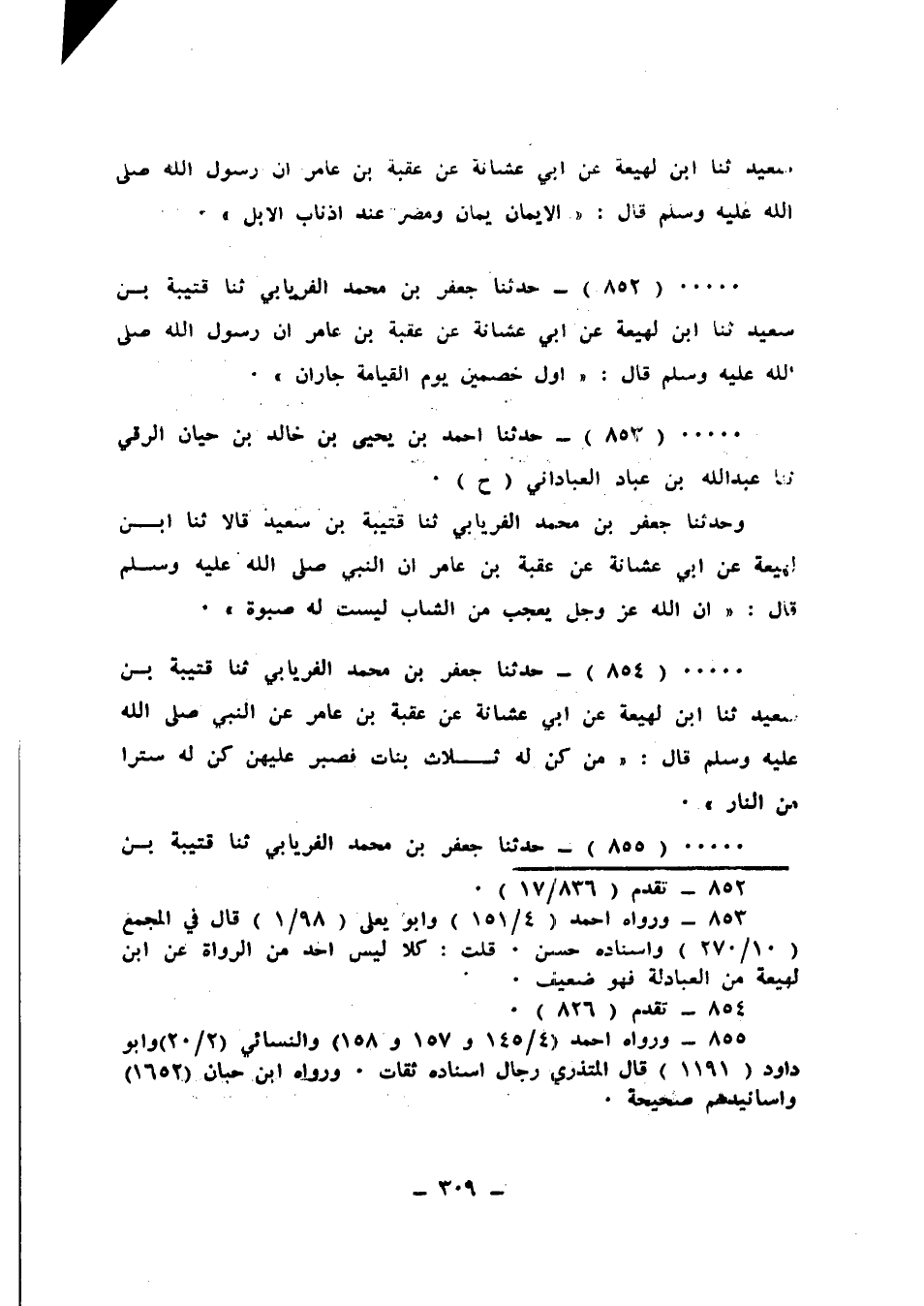 855 - حَدَّثَنَا جَعْفَرُ بْنُ مُحَمَّدٍ الْفِرْيَابِيُّ، ثَنَا قُتَيْبَةُ بْنُ سَعِيدٍ، ثَنَا ابْنُ لَهِيعَةَ، عَنْ أَبِي عُشَّانَةَ، عَنْ عُقْبَةَ بْنِ عَامِرٍ، عَنِ النَّبِيِّ صَلَّى اللهُ عَلَيْهِ وَسَلَّمَ قَالَ: «§يَعْجَبُ رَبُّكُمْ مِنْ رَاعِي غَنَمٍ فِي شَظِيَّةٍ يُؤَذِّنُ بِالصَّلَاةِ وَيُقِيمُ»