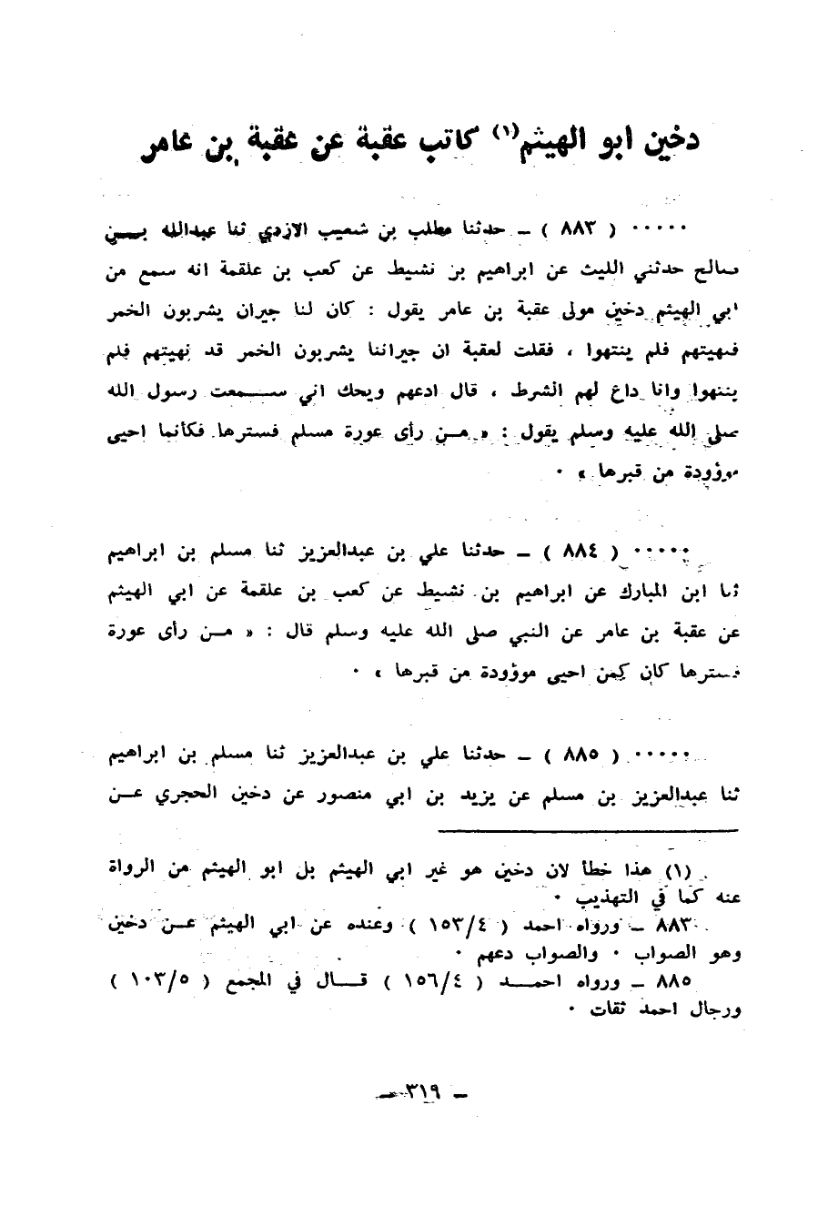 883 - حَدَّثَنَا مُطَّلِبُ بْنُ شُعَيْبٍ الْأَزْدِيُّ، ثَنَا عَبْدُ اللهِ بْنُ صَالِحٍ، حَدَّثَنِي اللَّيْثُ، عَنْ إِبْرَاهِيمَ بْنِ نَشِيطٍ، عَنْ كَعْبِ بْنِ عَلْقَمَةَ، أَنَّهُ سَمِعَ مِنْ أَبِي الْهَيْثَمِ دُخَيْنٍ مَوْلَى عُقْبَةَ بْنِ عَامِرٍ يَقُولُ: كَانَ لَنَا جِيرَانٌ يَشْرَبُونَ الْخَمْرَ فَنَهَيْتُهُمْ فَلَمْ يَنْتَهُوا فَقُلْتُ لِعُقْبَةَ: إِنَّ جِيرَانَنَا يَشْرَبُونَ الْخَمْرَ قَدْ نَهَيْتُهُمْ فَلَمْ يَنْتَهُوا، وَأَنَا دَاعٍ لَهُمُ الشُّرَطَ قَالَ: دَعْهُمْ، وَيْحَكَ إِنِّي سَمِعْتُ رَسُولَ اللهِ صَلَّى اللهُ عَلَيْهِ وَسَلَّمَ يَقُولُ: «§مَنْ رَأَى عَوْرَةَ مُسْلِمٍ فَسَتَرَهَا فَكَأَنَّمَا أَحْيَا مَوْءُودَةً مِنْ قَبْرِهَا»