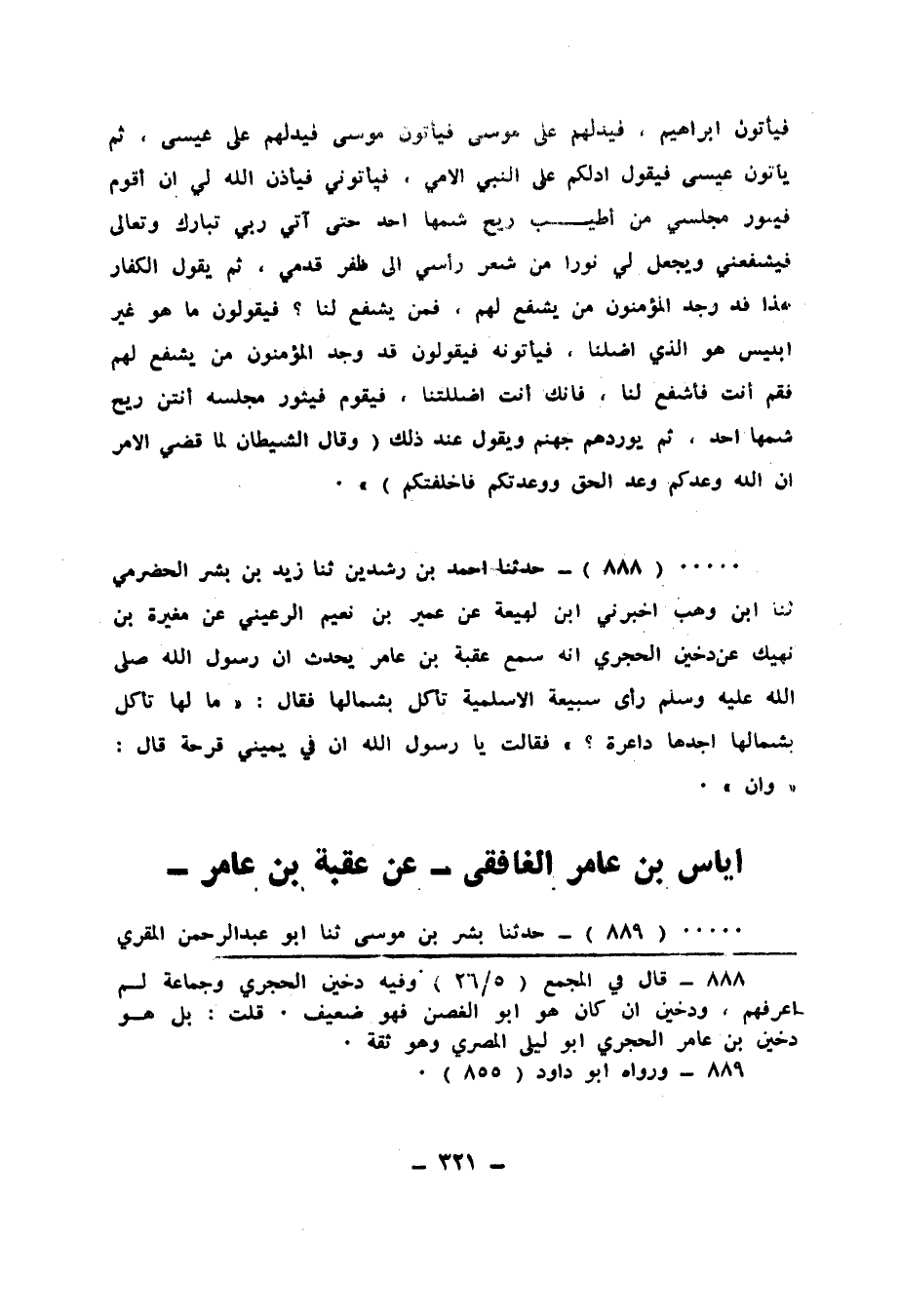 889 - حَدَّثَنَا بِشْرُ بْنُ مُوسَى، ثَنَا أَبُو عَبْدِ الرَّحْمَنِ الْمُقْرِئُ، ثَنَا مُوسَى بْنُ أَيُّوبَ الْغَافِقِيُّ، أَخْبَرَنِي عَمِّي إِيَاسُ بْنُ عَامِرٍ أَنَّهُ سَمِعَ عُقْبَةَ بْنَ عَامِرٍ الْجُهَنِيَّ يَقُولُ: لَمَّا نَزَلَتْ {سَبِّحِ اسْمَ رَبِّكَ الْأَعْلَى} [الأعلى: 1] قَالَ لَنَا رَسُولُ اللهِ صَلَّى اللهُ عَلَيْهِ وَسَلَّمَ: «§اجْعَلُوهَا فِي سُجُودِكُمْ»