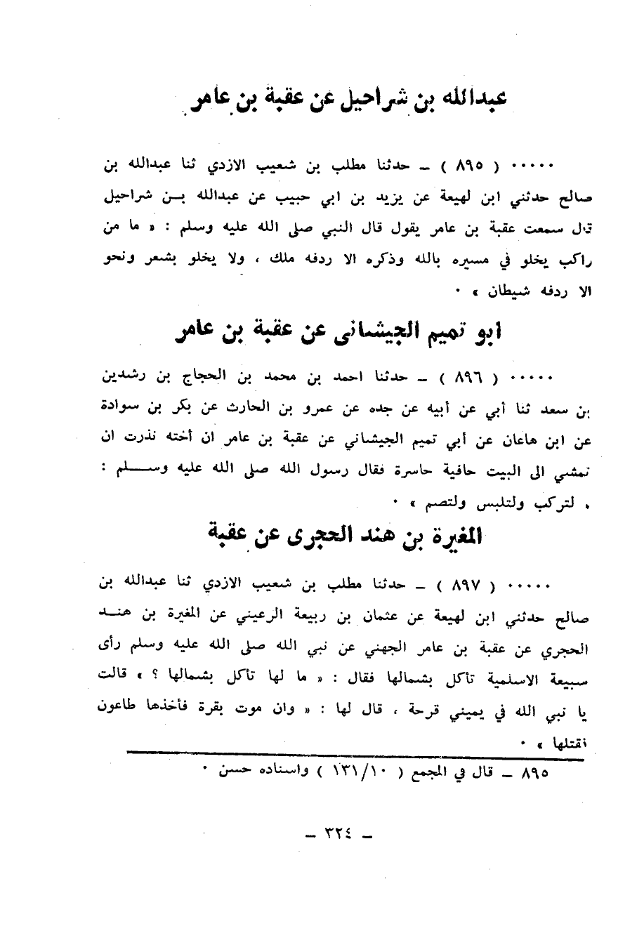 895 - حَدَّثَنَا مُطَّلِبُ بْنُ شُعَيْبٍ الْأَزْدِيُّ، ثَنَا عَبْدُ اللهِ بْنُ صَالِحٍ، حَدَّثَنِي ابْنُ لَهِيعَةَ، عَنْ يَزِيدَ بْنِ أَبِي حَبِيبٍ، عَنْ عَبْدِ اللهِ بْنِ شَرَاحِيلَ قَالَ: سَمِعْتُ عُقْبَةَ بْنَ عَامِرٍ، يَقُولُ: قَالَ النَّبِيُّ صَلَّى اللهُ عَلَيْهِ وَسَلَّمَ: «§مَا مِنْ رَاكِبٍ يَخْلُو فِي مَسِيرِهِ بِاللهِ وَذِكْرِهِ إِلَّا رَدَفَهُ مَلَكٌ، وَلَا يَخْلُو بِشِعْرٍ وَنَحْوِهِ إِلَّا رَدَفَهُ شَيْطَانٌ»