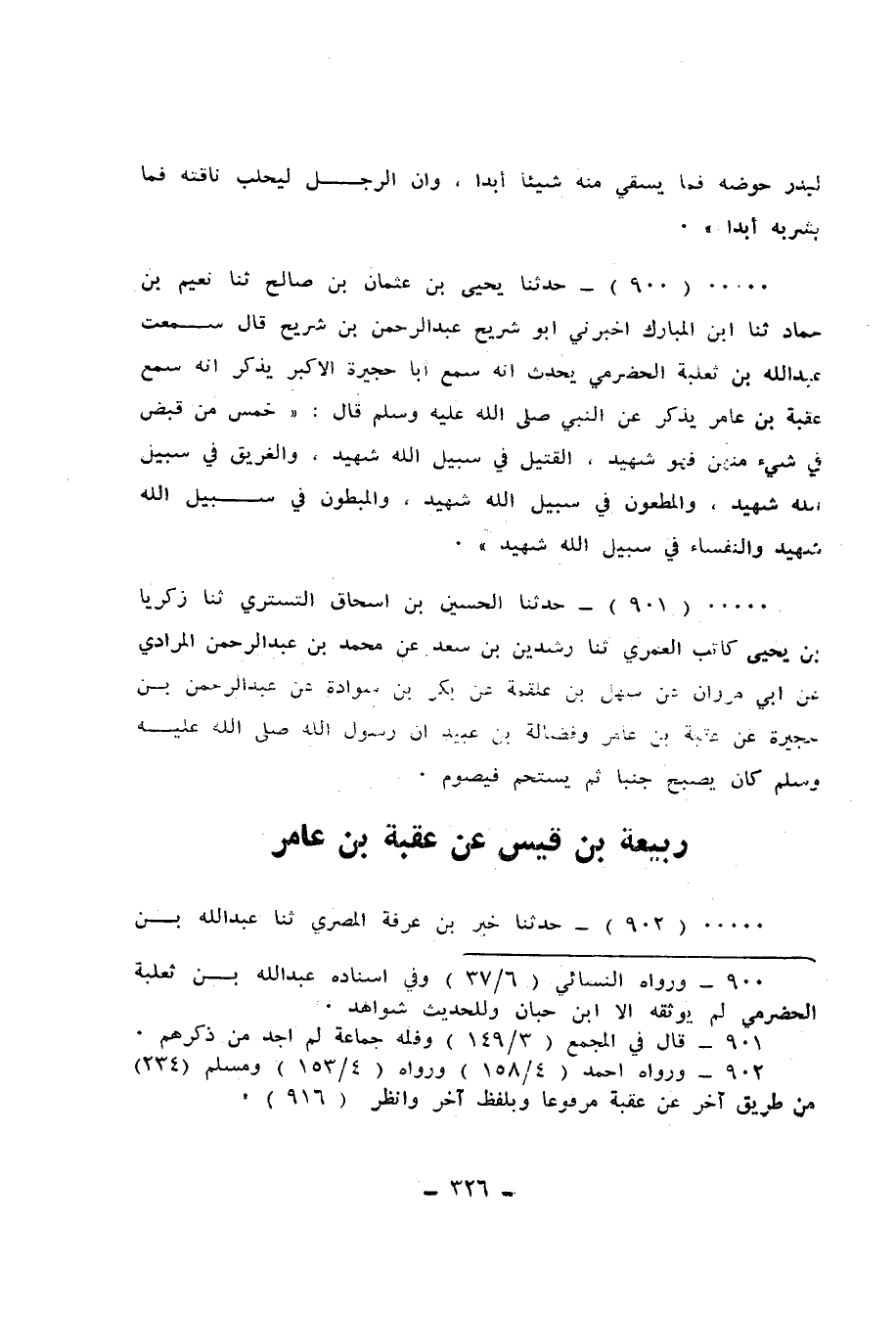 900 - حَدَّثَنَا يَحْيَى بْنُ عُثْمَانَ بْنِ صَالِحٍ، ثَنَا نُعَيْمُ بْنُ حَمَّادٍ، ثَنَا ابْنُ الْمُبَارَكِ، أَخْبَرَنِي أَبُو شُرَيْحٍ عَبْدُ الرَّحْمَنِ بْنُ شُرَيْحٍ قَالَ: سَمِعْتُ عَبْدَ اللهِ بْنَ ثَعْلَبَةَ الْحَضْرَمِيَّ، يُحَدِّثُ أَنَّهُ سَمِعَ أَبَا حُجَيْرَةَ الْأَكْبَرَ، يَذْكُرُ أَنَّهُ سَمِعَ عُقْبَةَ بْنَ عَامِرٍ يَذْكُرُ عَنِ النَّبِيِّ صَلَّى اللهُ عَلَيْهِ وَسَلَّمَ قَالَ: " §خَمْسٌ مَنْ قُبِضَ فِي شَيْءٍ مِنْهُنَّ فَهُوَ شَهِيدٌ: الْقَتِيلُ فِي سَبِيلِ اللهِ شَهِيدٌ، وَالْغَرِيقُ فِي سَبِيلِ اللهِ شَهِيدٌ، وَالْمَطْعُونُ فِي سَبِيلِ اللهِ شَهِيدٌ، وَالْمَبْطُونُ فِي سَبِيلِ اللهِ شَهِيدٌ، وَالنُّفَسَاءُ فِي سَبِيلِ اللهِ شَهِيدٌ "