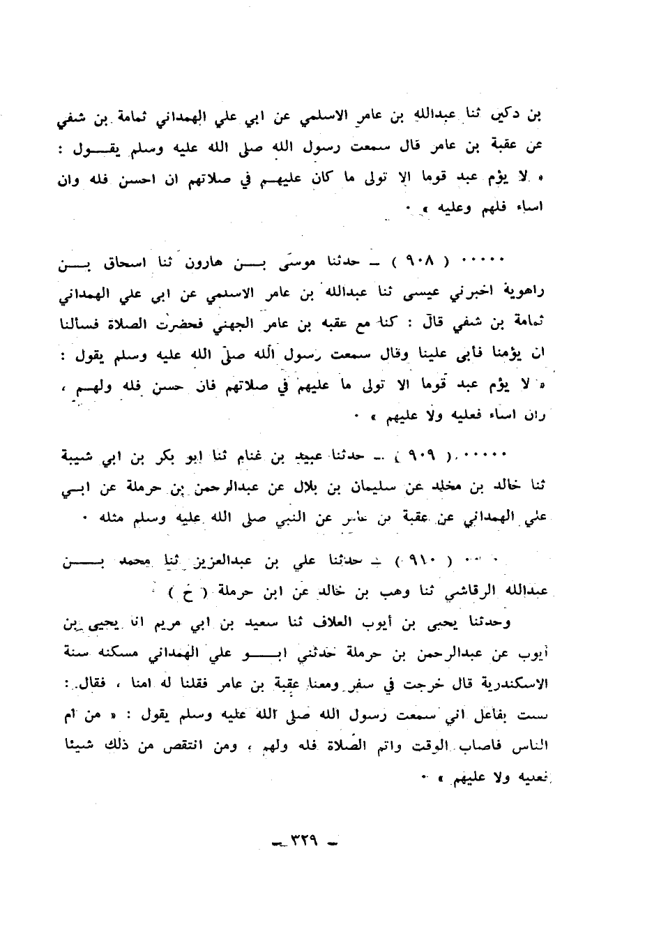910 - حَدَّثَنَا عَلِيُّ بْنُ عَبْدِ الْعَزِيزِ، ثَنَا مُحَمَّدُ بْنُ عَبْدِ اللهِ الرَّقَاشِيُّ، ثَنَا وَهْبُ بْنُ خَالِدٍ، عَنِ ابْنِ حَرْمَلَةَ، ح وَحَدَّثَنَا يَحْيَى بْنُ أَيُّوبَ الْعَلَّافُ، ثَنَا سَعِيدُ بْنُ أَبِي مَرْيَمَ، أَنَا يَحْيَى بْنُ أَيُّوبَ، عَنْ عَبْدِ الرَّحْمَنِ بْنِ حَرْمَلَةَ، حَدَّثَنِي أَبُو عَلِيٍّ الْهَمْدَانِيُّ - مَسْكَنُهُ سَنَةً الْإِسْكَنْدَرِيَّةُ - قَالَ: خَرَجْتُ فِي سَفَرٍ وَمَعَنَا عُقْبَةُ بْنُ عَامِرٍ فَقُلْنَا لَهُ: أُمَّنَا فَقَالَ: لَسْتُ بِفَاعِلٍ إنِّي سَمِعْتُ رَسُولَ اللهِ صَلَّى اللهُ عَلَيْهِ وَسَلَّمَ يَقُولُ: «§مَنْ أَمَّ النَّاسَ فَأَصَابَ الْوَقْتَ وَأَتَمَّ الصَّلَاةَ فَلَهُ وَلَهُمْ، وَمَنِ انْتَقَصَ مِنْ ذَلِكَ شَيْئًا فَعَلَيْهِ وَلَا عَلَيْهِمْ»