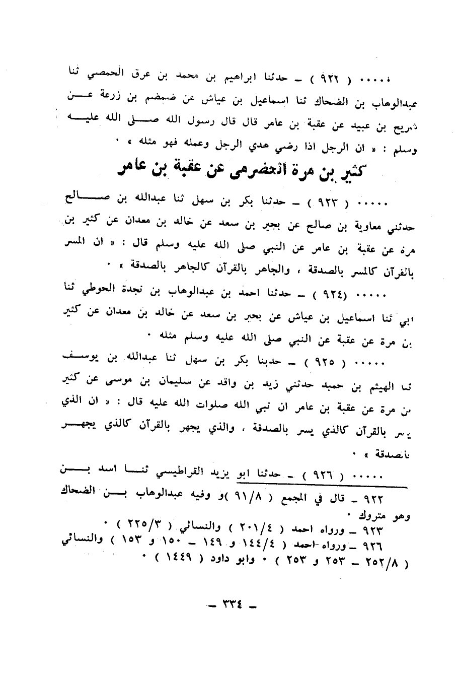 923 - حَدَّثَنَا بَكْرُ بْنُ سَهْلٍ، ثَنَا عَبْدُ اللهِ بْنُ صَالِحٍ، حَدَّثَنِي مُعَاوِيَةُ بْنُ صَالِحٍ، عَنْ بَحِيرِ بْنِ سَعْدٍ، عَنْ خَالِدِ بْنِ مَعْدَانَ، عَنْ كَثِيرِ بْنِ مُرَّةَ، عَنْ عُقْبَةَ بْنِ عَامِرٍ، عَنِ النَّبِيِّ صَلَّى اللهُ عَلَيْهِ وَسَلَّمَ قَالَ: «إِنَّ §الْمُسِرَّ بِالْقُرْآنِ كَالْمُسِرِّ بِالصَّدَقَةِ وَالْجَاهِرَ بِالْقُرْآنِ كَالْجَاهِرِ بِالصَّدَقَةِ»