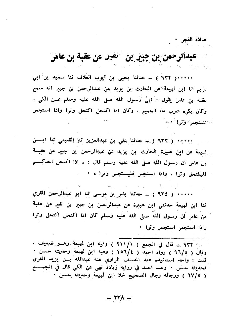 934 - حَدَّثَنَا بِشْرُ بْنُ مُوسَى، ثَنَا أَبُو عَبْدِ الرَّحْمَنِ الْمُقْرِئُ، ثَنَا ابْنُ لَهِيعَةَ، حَدَّثَنِي ابْنُ هُبَيْرَةَ، عَنْ عَبْدِ الرَّحْمَنِ بْنِ جُبَيْرِ بْنِ نُفَيْرٍ، عَنْ عُقْبَةَ بْنِ عَامِرٍ، أَنَّ رَسُولَ اللهِ صَلَّى اللهُ عَلَيْهِ وَسَلَّمَ كَانَ «§إِذَا اكْتَحَلَ اكْتَحَلَ وِتْرًا، وَإِذَا اسْتَجْمَرَ اسْتَجْمَرَ وِتْرًا»