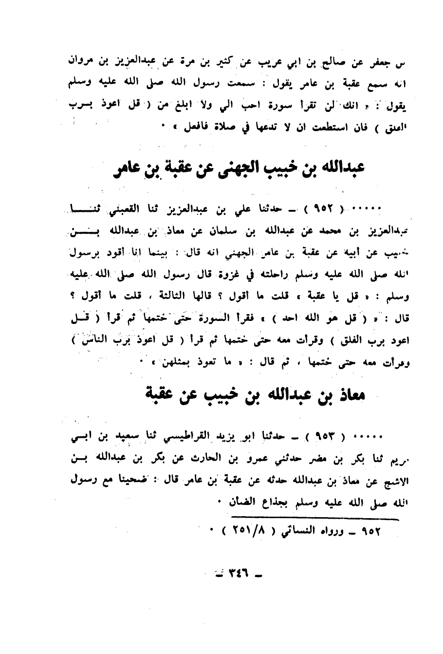 952 - حَدَّثَنَا عَلِيُّ بْنُ عَبْدِ الْعَزِيزِ، ثَنَا الْقَعْنَبِيُّ، ثَنَا عَبْدُ الْعَزِيزِ بْنُ مُحَمَّدٍ، عَنْ عَبْدِ اللهِِ بْنِ سَلْمَانَ، عَنْ مُعَاذِ بْنِ عَبْدِ اللهِ بْنِ خُبَيْبٍ، عَنْ أَبِيهِ، عَنْ عُقْبَةَ بْنِ عَامِرٍ الْجُهَنِيِّ، أَنَّهُ قَالَ: بَيْنَمَا أَنَا أَقُودُ بِرَسُولِ اللهِ صَلَّى اللهُ عَلَيْهِ وَسَلَّمَ رَاحِلَتََهُ فِي غَزْوَةٍ، قَالَ رَسُولُ اللهِ صَلَّى اللهُ عَلَيْهِ وَسَلَّمَ: «قُلْ يَا عُقْبَةُ» ، قُلْتُ: مَا أَقُولُ؟ قَالَهَا الثَّالِثَةَ، قُلْتُ: مَا أَقُولُ؟ قَالَ: قُلْ هُوَ اللهُ أَحَدٌ، فَقَرَأَ السُّورَةَ حَتَّى خَتَمَهَا، ثُمَّ قَرَأَ قُلْ أَعُوذُ بِرَبِّ الْفَلَقِ وَقَرَأْتُ مَعَهُ حَتَّى خَتَمَهَا، ثُمَّ قَرَأَ قُلْ أَعُوذُ بِرَبِّ النَّاسِ وَقَرَأْتُ مَعَهُ حَتَّى خَتَمَهَا، ثُمَّ قَالَ: «§مَا تُعُوِّذَ بِمِثْلِهِنَّ»