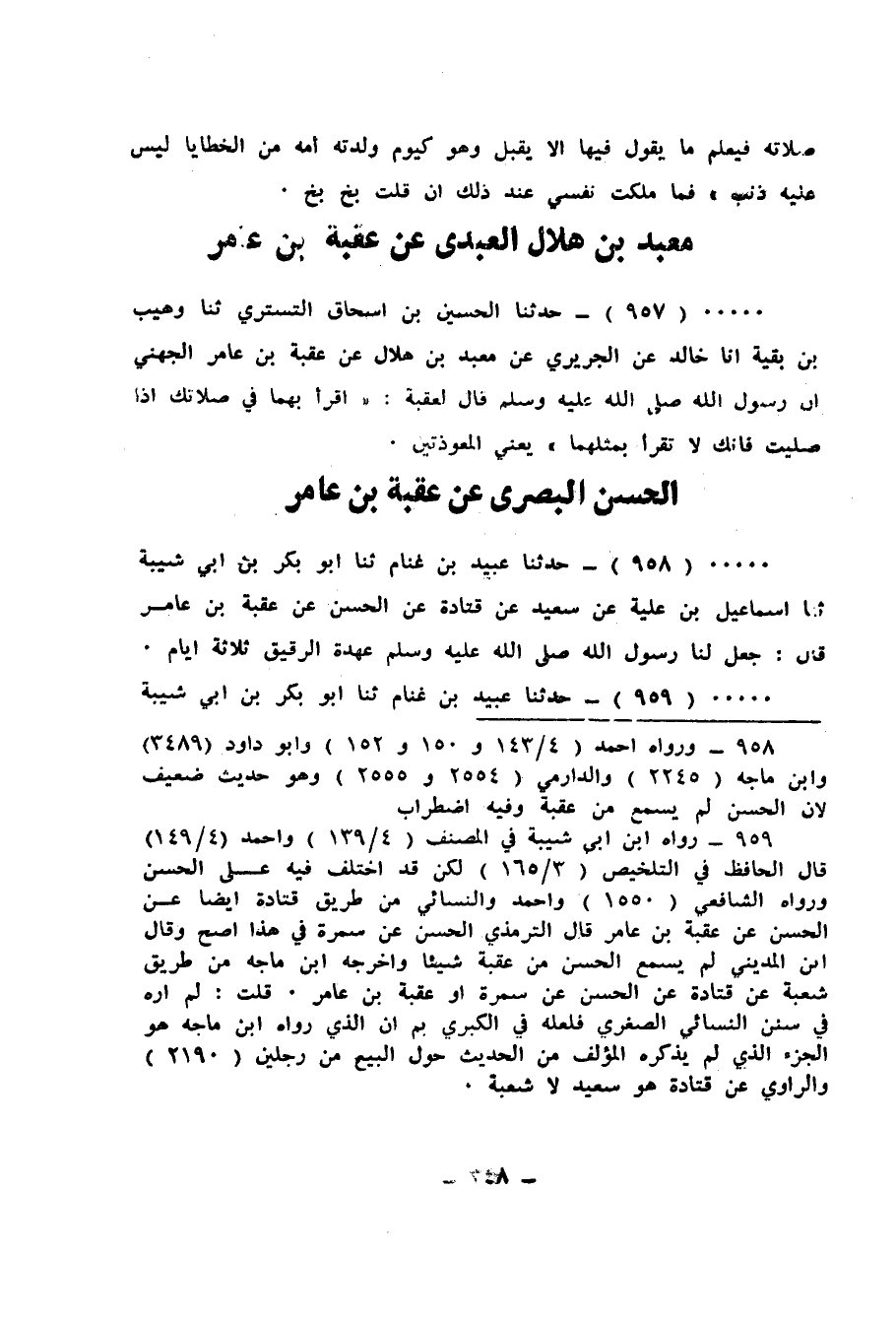 957 - حَدَّثَنَا الْحُسَيْنُ بْنُ إِسْحَاقَ التُّسْتَرِيُّ، ثَنَا وُهَيْبُ بْنُ بَقِيَّةَ، أَنَا خَالِدٌ، عَنِ الْجُرَيْرِيِّ، عَنْ مَعْبَدِ بْنِ هِلَالٍ، عَنْ عُقْبَةَ بْنِ عَامِرٍ الْجُهَنِيِّ، أَنَّ رَسُولَ اللهِ صَلَّى اللهُ عَلَيْهِ وَسَلَّمَ قَالَ لِعُقْبَةَ: «§اقْرَأْ بِهِمَا فِي صَلَاتِكَ إِذَا صَلَّيْتَ فَإِنَّكَ لَا تَقْرَأُ بِمِثْلِهِمَا - يَعْنِي الْمُعَوِّذَتَيْنِ -»