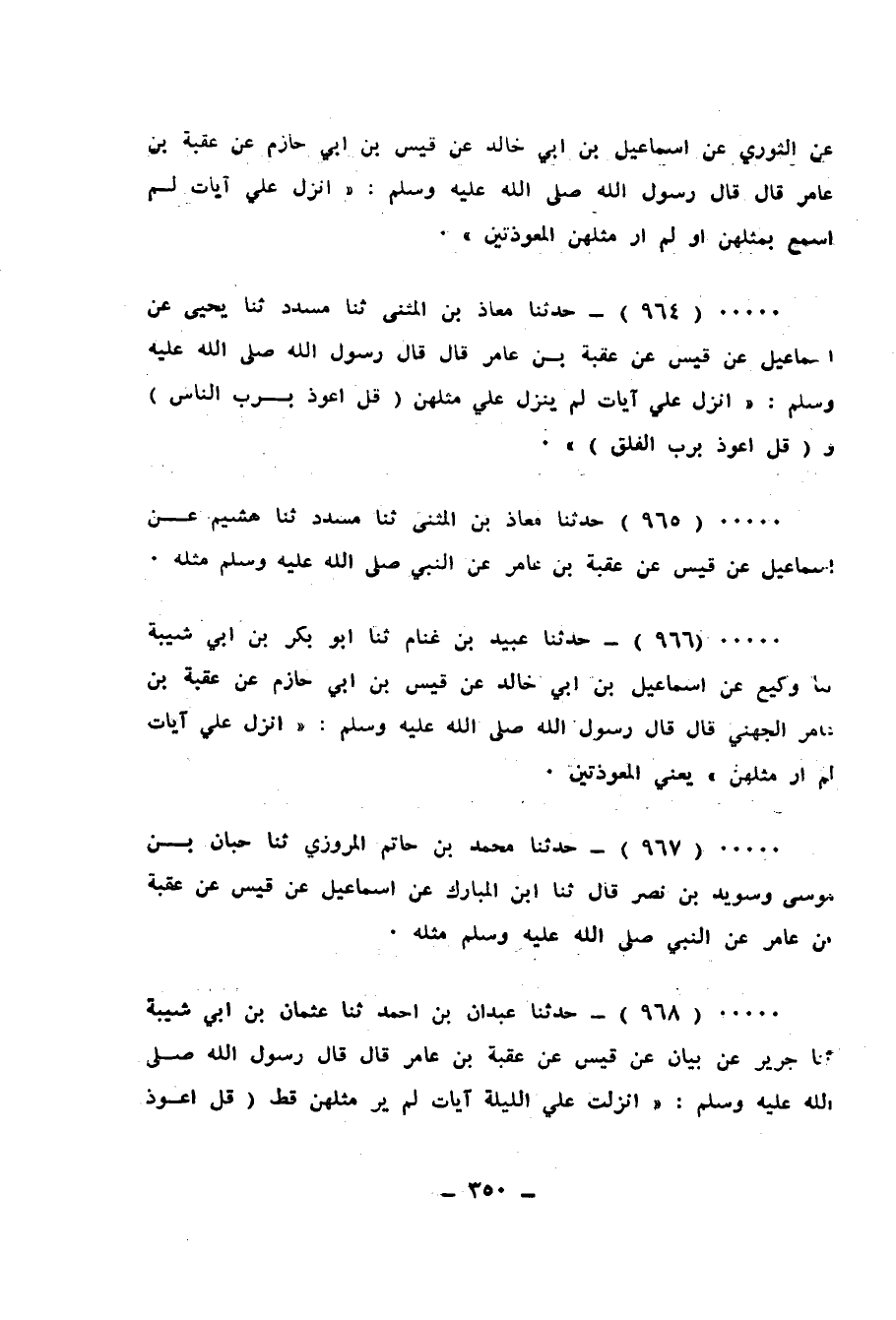 964 - حَدَّثَنَا مُعَاذُ بْنُ الْمُثَنَّى، ثَنَا مُسَدَّدٌ، ثَنَا يَحْيَى، عَنْ إِسْمَاعِيلَ، عَنْ قَيْسٍ، عَنْ عُقْبَةَ بْنِ عَامِرٍ قَالَ: قَالَ رَسُولُ اللهِ صَلَّى اللهُ عَلَيْهِ وَسَلَّمَ: «§أُنْزِلَ عَلَيَّ آيَاتٌ لَمْ يَنْزِلْ عَلَيَّ مِثْلَهُنَّ قُلْ أَعُوذُ بِرَبِّ النَّاسِ وَقُلْ أَعُوذُ بِرَبِّ الْفَلَقِ»