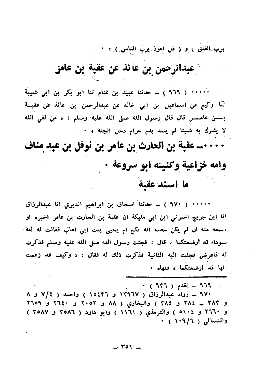 969 - حَدَّثَنَا عُبَيْدُ بْنُ غَنَّامٍ، ثَنَا أَبُو بَكْرِ بْنُ أَبِي شَيْبَةَ، ثَنَا وَكِيعٌ، عَنْ إِسْمَاعِيلَ بْنِ أَبِي خَالِدٍ، عَنْ عَبْدِ الرَّحْمَنِ بْنِ عَائِذٍ، عَنْ عُقْبَةَ بْنِ عَامِرٍ قَالَ: قَالَ رَسُولُ اللهِ صَلَّى اللهُ عَلَيْهِ وَسَلَّمَ: «§مَنْ لَقِيَ اللهَ لَا يُشْرِكُ بِهِ شَيْئًا لَمْ يَتَنَدَّ بِدَمٍ حَرَامٍ دَخَلَ الْجَنَّةَ»