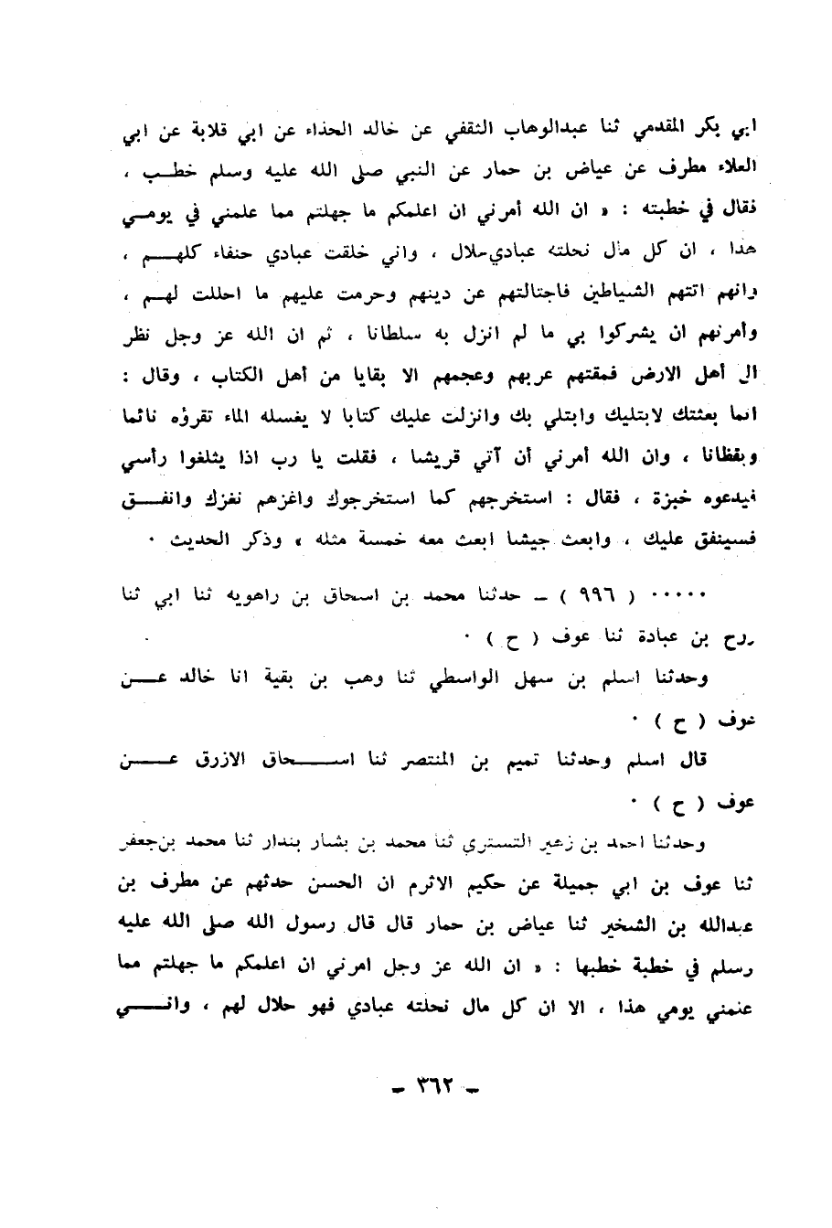 996 - حَدَّثَنَا مُحَمَّدُ بْنُ إِسْحَاقَ بْنِ رَاهَوَيْهِ، ثَنَا أَبِي، ثَنَا رَوْحُ بْنُ عُبَادَةَ، ثَنَا عَوْفٌ، ح وَحَدَّثَنَا أَسْلَمُ بْنُ سَهْلٍ الْوَاسِطِيُّ، ثَنَا وَهْبُ بْنُ بَقِيَّةَ، أَنَا خَالِدٌ، عَنْ عَوْفٍ، ح قَالَ أَسْلَمُ: وَحَدَّثَنَا تَمِيمُ بْنُ الْمُنْتَصِرِ، ثَنَا إِسْحَاقُ الْأَزْرَقُ، عَنْ عَوْفٍ، ح وَحَدَّثَنَا أَحْمَدُ بْنُ زُهَيْرٍ التُّسْتَرِيُّ، ثَنَا مُحَمَّدُ بْنُ بَشَّارٍ بُنْدَارٌ، ثَنَا مُحَمَّدُ بْنُ جَعْفَرٍ، ثَنَا عَوْفُ بْنُ أَبِي جَمِيلَةَ، عَنْ حَكِيمٍ الْأَثْرَمِ، أَنَّ الْحَسَنَ حَدَّثَهُمْ، عَنْ مُطَرِّفِ بْنِ عَبْدِ اللهِ بْنِ الشِّخِّيرِ، ثَنَا عِيَاضُ بْنُ حِمَارٍ، قَالَ: قَالَ رَسُولُ اللهِ صَلَّى اللهُ عَلَيْهِ وَسَلَّمَ فِي خُطْبَةٍ خَطَبَهَا: " إِنَّ اللهَ عَزَّ وَجَلَّ أَمَرَنِي أَنْ أُعَلِّمَكُمْ مَا جَهِلْتُمْ مِمَّا عَلَّمَنِي يَوْمِي هَذَا، أَلَا إِنَّ §كُلَّ مَالٍ نَحَلْتُهُ عِبَادِي فَهُوَ حَلَالٌ لَهُمْ، وَإِنِّي خَلَقْتُ عِبَادِي حُنَفَاءَ كُلَّهُمْ وَإِنَّ الشَّيَاطِينَ أَتَتْهُمْ فَاجْتَالَتْهُمْ عَنْ دِينِهِمْ، وَحَرَّمَتْ عَلَيْهِمْ الَّذِي أَحْلَلْتُ لَهُمْ، وَأَمَرَتْهُمْ أَنْ يُشْرِكُوا بِي مَا لَمْ أُنَزِّلْ بِهِ سُلْطَانًا، وَإِنَّ اللهَ نَظَرَ إِلَى أَهْلِ الْأَرْضِ مِنْ قَبْلِ أَنْ يَبْعَثَنِي فَمَقَتَهُمْ كُلَّهُمْ عَرَبَهُمْ وَعَجَمَهُمْ إلَّا بَقَايَا مِنْ أَهْلِ الْكِتَابِ، وَإِنَّ اللهَ قَالَ: إِنَّمَا بَعَثْتُكَ لِأَبْتَلِيَكَ وَأَبْتَلِيَ بِكَ، وَأَنْزَلْتُ عَلَيْكَ كِتَابًا لَا يَغْسِلُهُ الْمَاءُ تَقْرَؤُهُ نَائِمًا وَيَقْظَانًا، وَإِنَّ اللهَ أَوْحَى إِلَيَّ أَنْ أَغْزُوَ قُرَيْشًا فَقُلْتُ: يَا رَبِّ، إِذًا يَثْلَغُوا رَأْسِي فَيَذَرُوهُ خُبْزَةً، فَقَالَ: أَخْرِجْهُمْ كَمَا اسْتَخْرَجُوكَ وَاغْزُهُمْ فَسَنُغْزِكَ، وَابْعَثْ جَيْشًا نَبْعَثْ خَمْسَةً أَمْثَالَهُ، وَأَنْفِقْ يُنْفَقْ عَلَيْكَ، وَقَاتِلْ بِمَنْ أَطَاعَكَ مَنَ عَصَاكَ، وَقَالَ: أَهْلُ الْجَنَّةِ ثَلَاثَةٌ: إِمَامٌ مُقْسِطٌ، وَرَجُلٌ رَحِيمٌ رَقِيقُ الْقَلْبِ بِكُلِّ ذِي قُرْبَى وَمُسْلِمٍ، وَرَجُلٌ غَنِيٌّ عَفِيفٌ مُتَصَدِّقٌ، وَأَهْلُ النَّارِ خَمْسَةٌ: الضَّعِيفُ الَّذِي لَا زَبْرَ لَهُ وَالَّذِينَ هُمْ فِيكُمْ تَبَعٌ لَا يَبْغُونَ أَهْلًا وَلَا مَالًا، وَرَجُلٌ إِذَا أَصْبَحَ يُخَادِعُكَ عَنْ أَهْلِكَ وَمَالِكَ، وَرَجُلٌ لَا يُخْفَى لَهُ طَمَعٌ وَإِنْ دَقَّ إلَّا ذَهَبَ بِهِ، وَالشِّنْظِيرُ الْفَحَّاشُ " وَذَكَرَ الْبُخْلَ وَالْكَذِبَ
