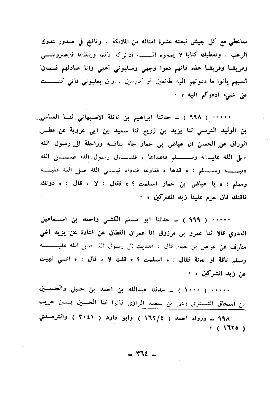 999 - حَدَّثَنَا أَبُو مُسْلِمٍ الْكَشِّيُّ، وَأَحْمَدُ بْنُ إِسْمَاعِيلَ الْعَدَوِيُّ، قَالَا: ثَنَا عَمْرُو بْنُ مَرْزُوقٍ، أَنَا عِمْرَانُ الْقَطَّانُ، عَنْ قَتَادَةَ، عَنْ يَزِيدَ، أَخِي مُطَرِّفٍ، عَنْ عِيَاضِ بْنِ حِمَارٍ، قَالَ: أَهْدَيْتُ إِلَى رَسُولِ اللهِ صَلَّى اللهُ عَلَيْهِ وَسَلَّمَ نَاقَةً أَوْ بَدَنَةً فَقَالَ: «أَسْلَمْتَ؟» قُلْتُ: لَا، قَالَ: «إِنِّي §نُهِيتُ عَنْ زَبْدِ الْمُشْرِكِينَ»