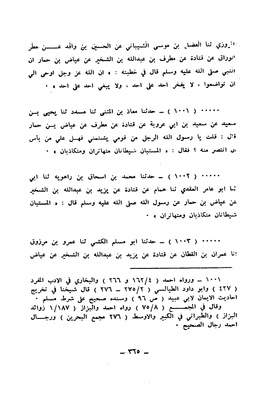 1001 - حَدَّثَنَا مُعَاذُ بْنُ الْمُثَنَّى، ثَنَا مُسَدَّدٌ، ثَنَا يَحْيَى بْنُ سَعِيدٍ، عَنْ سَعِيدِ بْنِ أَبِي عَرُوبَةَ، عَنْ قَتَادَةَ، عَنْ مُطَرِّفٍ، عَنْ عِيَاضِ بْنِ حِمَارٍ، قَالَ: قُلْتُ: يَا رَسُولَ اللهِ، الرَّجُلُ مِنْ قَوْمِي يَشْتُمُنِي فَهَلْ عَلَيَّ مِنْ بَأْسٍ أَنْ أَنْتَصِرَ مِنْهُ؟ فَقَالَ: «§الْمُسْتَبَّانِ شَيْطَانَانِ مُتَهاتِرَانِ وَمُتَكاذِبَانِ»