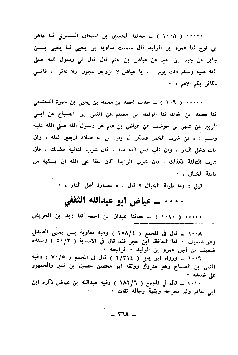 1009 - حَدَّثَنَا أَحْمَدُ بْنُ مُحَمَّدِ بْنِ يَحْيَى بْنِ حَمْزَةَ الدِّمَشْقِيُّ، ثَنَا مُحَمَّدُ بْنُ خَالِدٍ، ثَنَا الْوَلِيدُ بْنُ مُسْلِمٍ، عَنِ الْمُثَنَّى بْنُ الصَّبَّاحِ، عَنْ أَبِي الزُّبَيْرِ، عَنْ شَهْرِ بْنِ حَوْشَبٍ، عَنْ عِيَاضِ بْنِ غَنْمٍ، عَنْ رَسُولِ اللهِ صَلَّى اللهُ عَلَيْهِ وَسَلَّمَ: «§مَنْ شَرِبَ الْخَمْرَ فَسَكِرَ لَمْ يُقْبَلْ لَهُ صَلَاةٌ أَرْبَعِينَ لَيْلَةً، وَإِنْ مَاتَ دَخَلَ النَّارَ، وَإِنْ تَابَ قَبِلَ اللهُ مِنْهُ، فَإِنْ شَرِبَ الثَّانِيَةَ فَكَذَلِكَ، فَإِنْ شَرِبَ الثَّالِثَةَ فَكَذَلِكَ، فَإِنْ شَرِبَ الرَّابِعَةَ كَانَ حَقًّا عَلَى اللهِ أَنْ يَسْقِيَهُ مِنْ طِينَةِ الْخَبَالِ» ، قِيلَ: وَمَا طِينَةُ الْخَبَالِ؟ قَالَ: «عُصَارَةُ أَهْلِ النَّارِ»