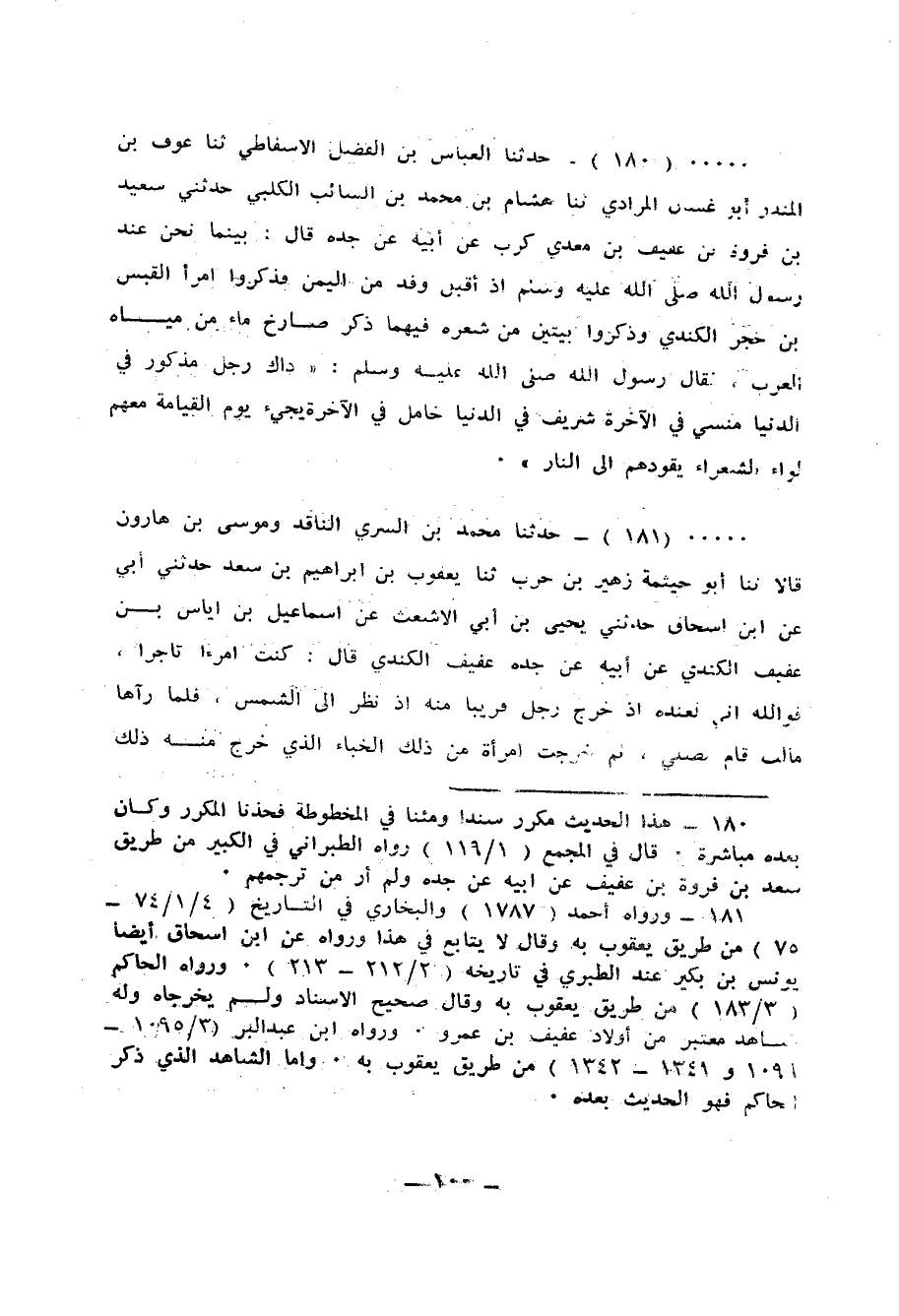 181 - حَدَّثَنَا مُحَمَّدُ بْنُ السَّرِيِّ النَّاقِدُ، وَمُوسَى بْنُ هَارُونَ قَالَا: ثنا أَبُو خَيْثَمَةَ زُهَيْرُ بْنُ حَرْبٍ، ثنا يَعْقُوبُ بْنُ إِبْرَاهِيمَ بْنِ سَعْدٍ، حَدَّثَنِي أَبِي، عَنِ ابْنِ إِسْحَاقَ، حَدَّثَنِي يَحْيَى بْنُ أَبِي الْأَشْعَثِ، عَنْ إِسْمَاعِيلَ بْنِ إِيَاسِ بْنِ عَفِيفٍ الْكِنْدِيِّ، عَنْ أَبِيهِ، عَنْ جَدِّهِ عَفِيفٍ الْكِنْدِيِّ قَالَ: كُنْتُ امْرَأً تَاجِرًا فَوَاللهِ إِنِّي لَعِنْدَهُ إِذْ خَرَجَ رَجُلٌ قَرِيبًا مِنْهُ، إِذْ §نَظَرَ إِلَى الشَّمْسِ، فَلَمَّا رَآهَا مَالَتْ قَامَ يُصَلِّي، ثُمَّ خَرَجْتِ امْرَأَةٌ مِنْ ذَلِكَ الْخِبَاءِ الَّذِي خَرَجَ مِنْهُ ذَلِكَ الرَّجُلُ، فَقَامَتْ خَلْفَهُ تُصَلِّي، ثُمَّ خَرَجَ غُلَامٌ حِينَ رَاهَقَ الْحُلُمَ مِنْ ذَلِكَ الْخِبَاءِ يُصَلِّي قُلْتُ لِلْعَبَّاسِ: مَنْ هَذَا؟ قَالَ: هَذَا مُحَمَّدُ بْنُ عَبْدِ اللهِ بْنِ عَبْدِ الْمُطَّلِبِ ابْنُ أَخِي قُلْتُ: وَمَنْ هَذِهِ الْمَرْأَةُ؟ قَالَ: امْرَأَتُهُ خَدِيجَةُ بِنْتُ خُوَيْلِدٍ، قُلْتُ: «مَنِ الْفَتَى؟» قَالَ: عَلِيُّ بْنُ أَبِي طَالِبِ ابْنُ عَمِّهِ قُلْتُ: «وَمَا هَذَا الَّذِي يَصْنَعُ؟» قَالَ: يُصَلِّي وَهُوَ يَزْعُمُ أَنَّهُ نَبِيٌّ وَلَمْ يَتْبَعْهُ عَلَى أَمْرِهِ إِلَّا امْرَأَتُهُ وَهَذَا الْفَتَى ابْنُ عَمِّهِ، وَهُوَ يَزْعُمُ أَنَّهُ سَيُفْتَحُ عَلَيْهِ كُنُوزُ كِسْرَى وَقَيْصَرِ، وَأَسْلَمَ عَفِيفٌ بَعْدَ ذَلِكَ، وَهُوَ ابْنُ عَمِّ الْأَشْعَثِ بْنِ قَيْسٍ وَكَانَ يَأْسَفُ عَلَى مَا فَاتَهُ مِنَ الْإِسْلَامِ يَوْمَئِذٍ