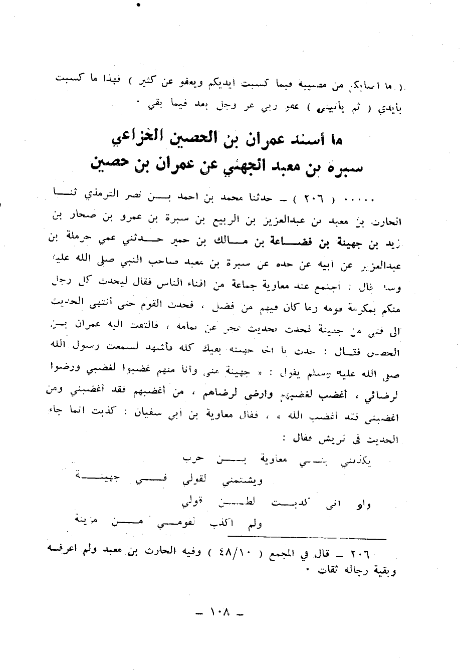 206 - حَدَّثَنَا مُحَمَّدُ بْنُ أَحْمَدَ بْنِ نَصْرٍ التِّرْمِذِيُّ، ثنا الْحَارِثُ بْنُ مَعْبَدِ بْنِ عَبْدِ الْعَزِيزِ بْنِ الرَّبِيعِ بْنِ سَبْرَةَ بْنِ عَمْرِو بْنِ صُحَارِ بْنِ زَيْدِ بْنِ جُهَيْنَةَ بْنِ قُضَاعَةَ بْنِ مَالِكِ بْنِ حِمْيَرٍ، حَدَّثَنِي عَمِّي حَرْمَلَةُ بْنُ عَبْدِ الْعَزِيزِ، عَنْ أَبِيهِ، عَنْ جَدِّهِ، عَنْ سَبْرَةَ بْنِ مَعْبَدٍ، صَاحِبِ النَّبِيِّ صَلَّى اللهُ عَلَيْهِ وَسَلَّمَ قَالَ: اجْتَمَعَ عِنْدَ مُعَاوِيَةَ جَمَاعَةٌ مِنْ أَفْنَاءِ النَّاسِ، فَقَالَ: لَيُحَدِّثُ كُلُّ رَجُلٍ مِنْكُمْ بِمَكْرُمَةِ قَوْمِهِ، وَمَا كَانَ فِيهِمْ مِنْ فَضْلٍ، فَحَدَّثَ الْقَوْمُ حَتَّى انْتَهَى الْحَدِيثُ إِلَى فَتًى مِنْ جُهَيْنَةَ، فَحَدَّثَ بِحَدِيثٍ عَجَزَ عَنْ تَمَامِهِ فَالْتَفَتَ إِلَيْهِ عِمْرَانُ بْنُ الْحُصَيْنِ فَقَالَ: حَدِّثْ يَا أَخَا جُهَيْنَةَ بِفِيكَ كُلِّهِ، فَأَشْهَدُ لَسَمِعْتُ رَسُولَ اللهِ صَلَّى اللهُ عَلَيْهِ وَسَلَّمَ يَقُولُ: «§جُهَيْنَةُ مِنِّي وَأَنَا مِنْهُمْ، غَضِبُوا لِغَضَبِي، وَرَضُوا لِرِضَائِي، أَغْضَبُ لِغَضَبِهِمْ وَأَرْضَى لِرِضَاهُمْ، مَنْ أَغْضَبَهُمْ فَقَدْ أَغْضَبَنِي، وَمَنْ أَغْضَبَنِي فَقَدْ أَغْضَبَ اللهَ» فَقَالَ مُعَاوِيَةُ بْنُ أَبِي سُفْيَانَ: كَذَبْتَ إِنَّمَا جَاءَ الْحَدِيثُ فِي قُرَيْشٍ فَقَالَ: