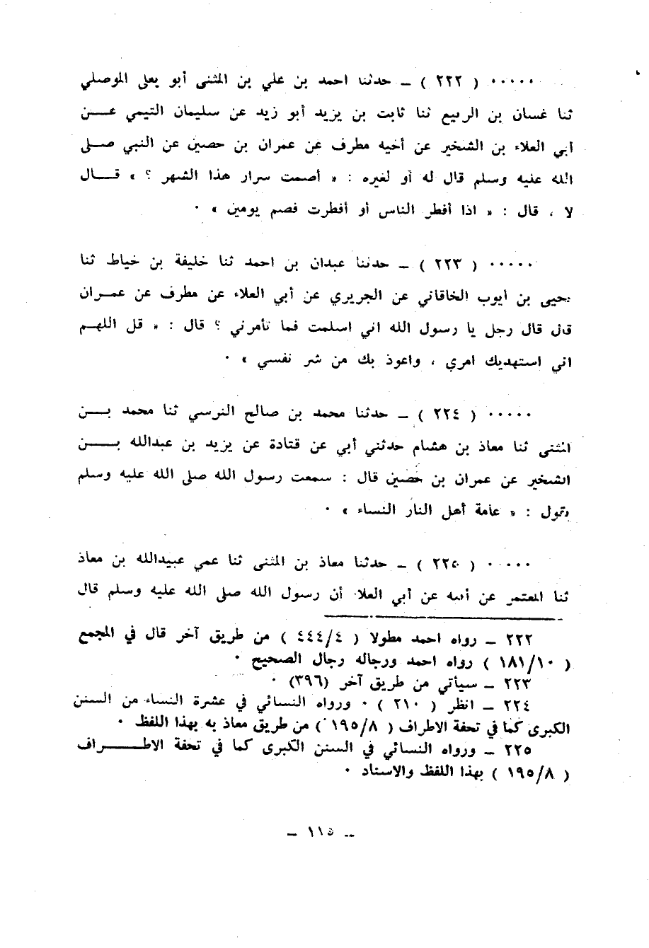 225 - حَدَّثَنَا مُعَاذُ بْنُ الْمُثَنَّى، ثنا عَمِّي عُبَيْدُ اللهِ بْنُ مُعَاذٍ، ثنا الْمُعْتَمِرُ، عَنْ أَبِيهِ، عَنْ أَبِي الْعَلَاءِ، أَنَّ رَسُولَ اللهِ صَلَّى اللهُ عَلَيْهِ وَسَلَّمَ قَالَ لِرَجُلٍ: «§أَصُمْتَ سُرَرَ هَذَا الشَّهْرِ؟» قَالَ: لَا، قَالَ: «فَإِذَا أَفْطَرْتَ فَصُمْ مَكَانَهُ يَوْمَيْنِ» فَسَأَلْتُ رَجُلًا مِنْ أَهْلِهِ عَمَّنْ يُحَدِّثُ هَذَا أَبُو الْعَلَاءِ؟ فَقَالَ: عِمْرَانُ بْنُ حُصَيْنٍ عَنِ النَّبِيِّ صَلَّى اللهُ عَلَيْهِ وَسَلَّمَ