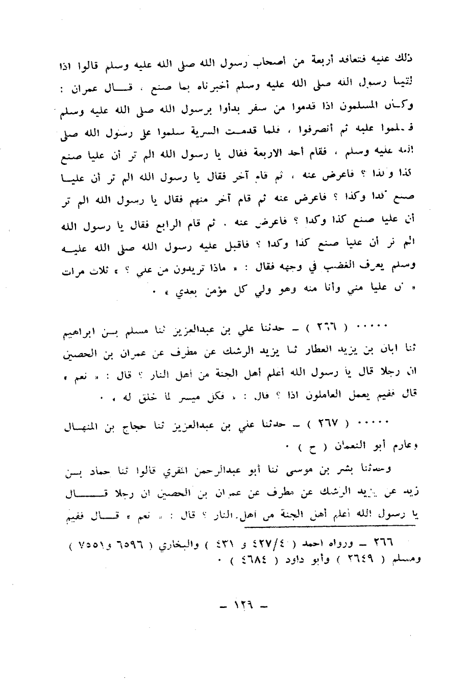 267 - حَدَّثَنَا عَلِيُّ بْنُ عَبْدِ الْعَزِيزِ، ثنا حَجَّاجُ بْنُ الْمِنْهَالِ، وَعَارِمٌ أَبُو النُّعْمَانِ، ح وَحَدَّثَنَا بِشْرُ بْنُ مُوسَى، ثنا أَبُو عَبْدِ الرَّحْمَنِ الْمُقْرِئُ قَالُوا: ثنا حَمَّادُ بْنُ زَيْدٍ، عَنْ يَزِيدَ الرِّشْكِ، عَنْ مُطَرِّفٍ، عَنْ عِمْرَانَ بْنِ الْحُصَيْنِ، أَنَّ رَجُلًا قَالَ: يَا رَسُولَ اللهِ، أَعُلِمَ أَهْلُ الْجَنَّةِ مِنْ أَهْلِ النَّارِ؟ قَالَ: «نَعَمْ» قَالَ: فَفِيمَ يَعْمَلُ الْعَامِلُونَ؟ قَالَ: «§اعْمَلُوا فَكُلٌّ مُيَسَّرٌ لِمَا خُلِقَ لَهُ»