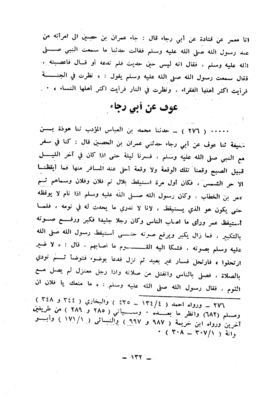 276 - حَدَّثَنَا مُحَمَّدُ بْنُ الْعَبَّاسِ الْمُؤَدِّبُ، ثنا هَوْذَةُ بْنُ خَلِيفَةَ، ثنا عَوْفٌ، عَنْ أَبِي رَجَاءٍ، حَدَّثَنِي عِمْرَانُ بْنُ الْحُصَيْنِ قَالَ: كُنَّا فِي سَفَرٍ مَعَ النَّبِيِّ صَلَّى اللهُ عَلَيْهِ وَسَلَّمَ، فَسِرْنَا لَيْلَةً حَتَّى إِذَا كَانَ فِي آخِرِ اللَّيْلِ قُبَيْلَ الصُّبْحِ وَقَعْنَا تِلْكَ الْوَقْعَةَ، وَلَا وَقْعَةَ أَحْلَى عِنْدَ الْمُسَافِرِ مِنْهَا، فَمَا أَيْقَظَنَا إِلَّا حُرُّ الشَّمْسِ، فَكَانَ أَوَّلَ مَرَّةٍ اسْتَيْقَظَ بِلَالٌ، ثُمَّ فُلَانٌ، وَفُلَانٌ، وَسَمَّاهُمْ، ثُمَّ عُمَرُ بْنُ الْخَطَّابِ، وَكَانَ رَسُولُ اللهِ صَلَّى اللهُ عَلَيْهِ وَسَلَّمَ إِذَا نَامَ لَا يُوقِظُهُ حَتَّى يَكُونَ هُوَ الَّذِي يَسْتَيْقِظُ لَأَنَّا لَا نَدْرِي مَا يَحْدُثُ لَهُ فِي نَوْمِهِ، فَلَمَّا اسْتَيْقَظَ عُمَرُ وَرَأَى مَا أَصَابَ النَّاسَ، وَكَانَ رَجُلًا جَلِيدًا، فَكَبَّرَ وَرَفَعَ صَوْتَهُ بِالتَّكْبِيرِ، فَمَا زَالَ يُكَبِّرُ وَيَرْفَعُ صَوْتَهُ حَتَّى اسْتَيْقَظَ رَسُولُ اللهِ صَلَّى اللهُ عَلَيْهِ وَسَلَّمَ بِصَوْتِهِ فَشَكَا إِلَيْهِ الْقَوْمُ مَا أَصَابَهُمْ، قَالَ: «لَا ضَيْرَ ارْتَحِلُوا» ، فَارْتَحَلَ فَسَارَ غَيْرَ بَعِيدٍ، ثُمَّ نَزَلَ فَدَعَا بِوَضُوءٍ فَتَوَضَّأَ، ثُمَّ نُودِي بِالصَّلَاةِ فَصَلَّى بِالنَّاسِ، وَانْفَتَلَ مِنْ صَلَاتِهِ، وَإِذَا رَجُلٌ مُعْتَزِلٌ لَمْ يُصَلِّ مَعَ الْقَوْمِ، فَقَالَ رَسُولُ اللهِ صَلَّى اللهُ عَلَيْهِ وَسَلَّمَ: «مَا مَنَعَكَ يَا فُلَانُ أَنْ -[133]- تُصَلِّيَ مَعَ الْقَوْمِ؟» فَقَالَ: يَا رَسُولَ اللهِ، أَصَابَتْنِي جَنَابَةٌ وَلَا مَاءَ، قَالَ: «§عَلَيْكَ بِالصَّعِيدِ فَإِنَّهُ يَكْفِيكَ» ، ثُمَّ سَارَ فَاشْتَكَى النَّاسُ إِلَيْهِ الْعَطَشَ، فَنَزَلَ فَدَعَا فُلَانًا - قَدْ سَمَّاهُ أَبُو رَجَاءٍ - فَدَعَا عَلِيًّا فَقَالَ لَهُمَا: «اذْهَبَا فَابْغِيَا الْمَاءَ» ، فَانْطَلَقَا فَيَسْتَقْبِلانِ امْرَأَةً بَيْنَ سَطِيحَتَيْنِ أَوْ مَزَادَتَيْنِ مِنْ مَاءٍ عَلَى بَعِيرٍ لَهَا، فَانْطَلَقَا فَقَالَا لَهَا: الْمَاءُ، فَقَالَتْ: عَهْدِي بِهِ أَمْسُ هَذِهِ السَّاعَةَ، فَقَالَا لَهَا: انْطَلِقِي إِذًا قَالَتْ: إِلَى أَيْنَ؟ قَالَا: إِلَى النَّبِيِّ صَلَّى اللهُ عَلَيْهِ وَسَلَّمَ قَالَتْ: هَذَا الَّذِي يُقَالُ لَهُ الصَّابِئُ؟ قَالَا: " هُوَ الَّذِي تَعْنِينَ، فَانْطَلِقِي فَجَاءَا بِهَا إِلَى رَسُولِ اللهِ صَلَّى اللهُ عَلَيْهِ وَسَلَّمَ فَحَدَّثَاهُ الْحَدِيثَ، فَاسْتَنْزَلُوهَا مِنْ بَعِيرِهَا، وَدَعَا رَسُولُ اللهِ صَلَّى اللهُ عَلَيْهِ وَسَلَّمَ بِإِنَاءٍ فَجَعَلَ فِيهِ أَفْوَاهَ السَّطِيحَتَيْنِ أَوِ الْمَزَادَتَيْنِ، ثُمَّ تَمَضْمَضَ فَأَعَادَهُ فِي الْإِنَاءِ، ثُمَّ أَعَادَهُ فِي أَفْوَاهِ السَّطِيحَتَيْنِ أَوِ الْمَزَادَتَيْنِ، ثُمَّ أَوْثَقَ أَفْوَاهَهُمَا وَأَطْلَقَ الْعَزَالِي وَنُودِيَ فِي النَّاسِ، أَنِ اسْقُوا، وَاسْتَقُوا فَسَقَى مَنْ شَاءَ وَاسْتَقَى مَنْ شَاءَ، فَكَانَ آخِرُ ذَلِكَ أَنْ أَعْطَاهُ الَّذِي أَصَابَتْهُ الْجَنَابَةُ، وَقَالَ: «اذْهَبْ فَأَفْرِغْهُ عَلَيْكَ» وَهِيَ قَائِمَةٌ تَنْظُرُ إِلَى مَا يَفْعَلُ بِمَائِهَا، وَايْمُ اللهِ لَقَدْ أَرْكَبَهَا حِينَ أَبْلَغَ وَإِنَّهُ لَيُخَيَّلُ إِلَيْنَا أَنَّهُمَا أَشَدُّ مِنْهُمَا مَلْأً، فَقَالَ رَسُولُ اللهِ صَلَّى اللهُ عَلَيْهِ وَسَلَّمَ: «اجْمَعُوا لَهَا مَا بَيْنَ عَجْوَةٍ وَسَوِيقَةٍ وَدَقِيقَةٍ» حَتَّى جَمَعُوا لَهَا طَعَامًا فِي ثَوْبٍ، وَحَمَلُوهَا عَلَى بَعِيرِهَا، وَوَضَعُوهَا بَيْنَ يَدَيْهَا، فَقَالَ لَهَا رَسُولُ اللهِ صَلَّى اللهُ عَلَيْهِ وَسَلَّمَ: «تَعْلَمِينَ وَاللهِ مَا رَزَأْنَاكِ فِي 