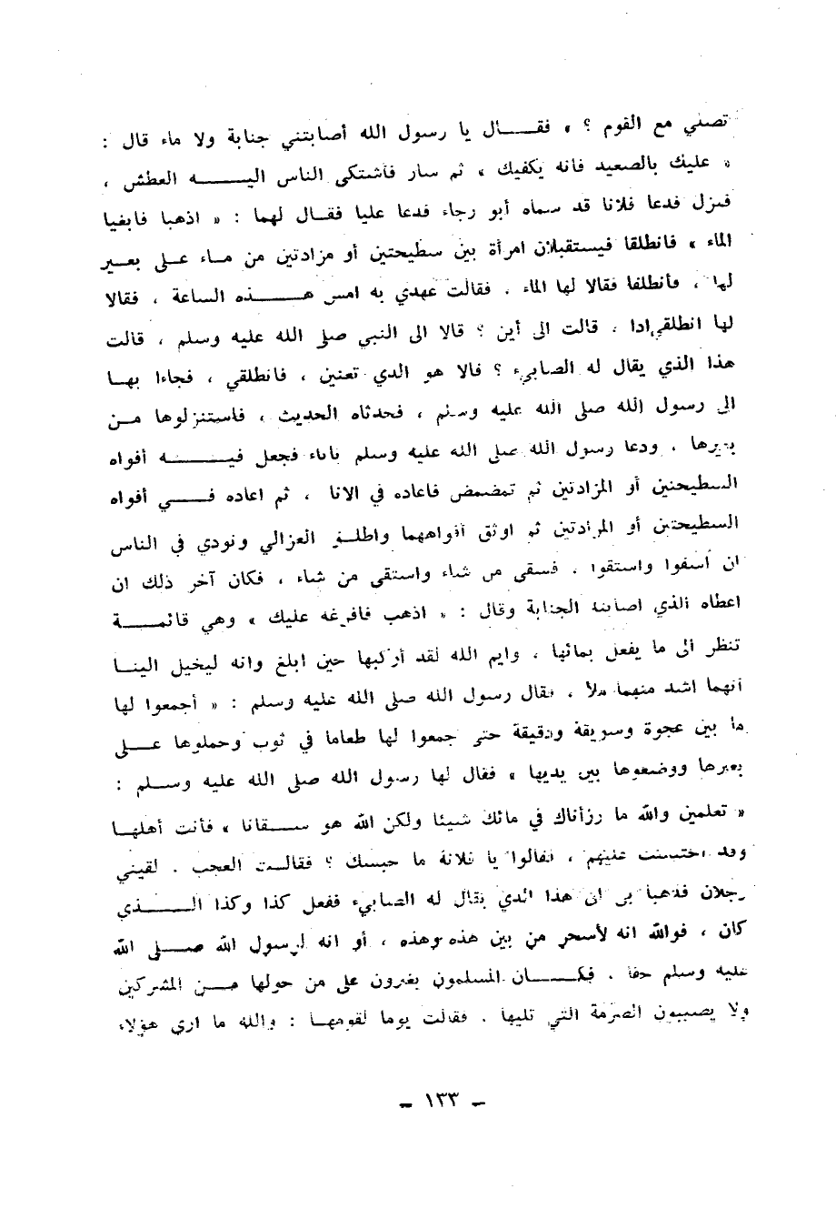 قَالاَ : إِلَى النَّبِيِّ صَلَّى اللَّهُ عَلَيْهِ وَسَلَّمَ قَالَتْ : هَذَا الَّذِي يُقَالُ لَهُ الصَّابِئُ ؟ قَالاَ : هُوَ الَّذِي تَعْنِينَ ، فَانْطَلِقِي فَجَاءَا بِهَا إِلَى رَسُولِ اللهِ صَلَّى اللَّهُ عَلَيْهِ وَسَلَّمَ فَحَدَّثَاهُ الْحَدِيثَ ، فَاسْتَنْزَلُوهَا مِنْ بَعِيرِهَا ، وَدَعَا رَسُولُ اللهِ صَلَّى اللَّهُ عَلَيْهِ وَسَلَّمَ بِإِنَاءٍ فَجَعَلَ فِيهِ أَفْوَاهَ السَّطِيحَتَيْنِ أَوِ الْمَزَادَتَيْنِ ، ثُمَّ تَمَضْمَضَ فَأَعَادَهُ فِي الإِنَاءِ ، ثُمَّ أَعَادَهُ فِي أَفْوَاهِ السَّطِيحَتَيْنِ أَوِ الْمَزَادَتَيْنِ ، ثُمَّ أَوْثَقَ أَفْوَاهَهُمَا وَأَطْلَقَ الْعَزَالِي وَنُودِيَ فِي النَّاسِ ، أَنِ اسْقُوا ، وَاسْتَقُوا فَسَقَى مَنْ شَاءَ وَاسْتَقَى مَنْ شَاءَ ، فَكَانَ آخِرُ ذَلِكَ أَنْ أَعْطَاهُ الَّذِي أَصَابَتْهُ الْجَنَابَةُ ، وَقَالَ : اذْهَبْ فَأَفْرِغْهُ عَلَيْكَ وَهِيَ قَائِمَةٌ تَنْظُرُ إِلَى مَا يَفْعَلُ بِمَائِهَا ، وَايْمُ اللهِ لَقَدْ أَرْكَبَهَا حِينَ أَبْلَغَ وَإِنَّهُ لَيُخَيَّلُ إِلَيْنَا أَنَّهُمَا أَشَدُّ مِنْهُمَا مَلأً ، فَقَالَ رَسُولُ اللهِ صَلَّى اللَّهُ عَلَيْهِ وَسَلَّمَ : اجْمَعُوا لَهَا مَا بَيْنَ عَجْوَةٍ وَسَوِيقَةٍ وَدَقِيقَةٍ حَتَّى جَمَعُوا لَهَا طَعَامًا فِي ثَوْبٍ ، وَحَمَلُوهَا عَلَى بَعِيرِهَا ، وَوَضَعُوهَا بَيْنَ يَدَيْهَا ، فَقَالَ لَهَا رَسُولُ اللهِ صَلَّى اللَّهُ عَلَيْهِ وَسَلَّمَ : تَعْلَمِينَ وَاللَّهِ مَا رَزَأْنَاكِ فِي مَائِكِ شَيْئًا ، وَلَكِنَّ اللَّهَ هُوَ سَقَانَا فَأَتَتْ أَهْلَهَا وَقَدِ احْتَبَسَتْ عَلَيْهِمْ ، فَقَالُوا : يَا فُلاَنَةُ مَا حَبَسَكِ ؟ فَقَالَتِ : الْعَجَبُ لَقِيَنِي رَجُلاَنِ ، فَذَهَبَا بِي إِلَى هَذَا الَّذِي يُقَالُ لَهُ الصَّابِئُ ، فَفَعَلَ كَذَا وَكَذَا الَّذِي كَانَ ، فَوَاللَّهِ إِنَّهُ لأَسْحَرُ مِنْ بَيْنَ هَذِهِ وَهَذِهِ ، أَوْ إِنَّهُ لِرَسُولُ اللهِ صَلَّى اللَّهُ عَلَيْهِ وَسَلَّمَ حَقًّا ، فَكَانَ الْمُسْلِمُونَ يُغِيْرُونَ عَلَى مَنْ حَوْلَهَا مِنَ الْمُشْرِكِينَ ، وَلاَ يُصِيبُونَ الصِّرْمَةَ الَّتِي تَلِيهَا ، فَقَالَتْ يَوْمًا لِقَوْمِهَا : وَاللَّهِ مَا أَرَى هَؤُلاَءِ الْقَوْمَ يَدْعُونَنَا ، فَهَلْ لَكُمْ فِي الإِسْلاَمِ ؟ فَطَاوَعُوهَا ، فَجَاءَ وَقَدْ دَخَلُوا جَمِيعًا فِي الإِسْلاَمِ.