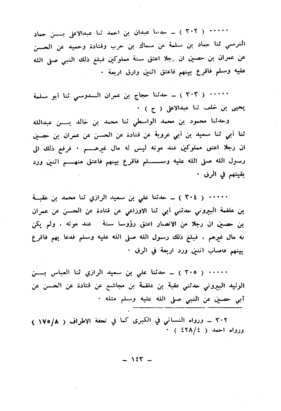 303 - حَدَّثَنَا حَجَّاجُ بْنُ عِمْرَانَ السَّدُوسِيُّ، ثنا أَبُو سَلَمَةَ يَحْيَى بْنُ خَلَفٍ، ثنا عَبْدُ الْأَعْلَى، ح وَحَدَّثَنَا مَحْمُودُ بْنُ مُحَمَّدٍ الْوَاسِطِيُّ، ثنا مُحَمَّدُ بْنُ خَالِدِ بْنِ عَبْدِ اللهِ، ثنا أَبِي، ثنا سَعِيدُ بْنُ أَبِي عَرُوبَةَ، عَنْ قَتَادَةَ، عَنِ الْحَسَنِ، عَنْ عِمْرَانَ بْنِ حُصَيْنٍ، أَنَّ §رَجُلًا أَعْتَقَ مَمْلُوكِينَ عِنْدَ مَوْتِهِ لَيْسَ لَهُ مَالٌ غَيْرُهُمْ، فَرُفِعَ ذَلِكَ إِلَى رَسُولِ اللهِ صَلَّى اللهُ عَلَيْهِ وَسَلَّمَ، «فَأَقْرَعَ بَيْنَهُمْ، فَأَعْتَقَ مِنْهُمُ اثْنَيْنِ وَرَدَّ بَقِيَّتَهُمْ فِي الرِّقِّ»