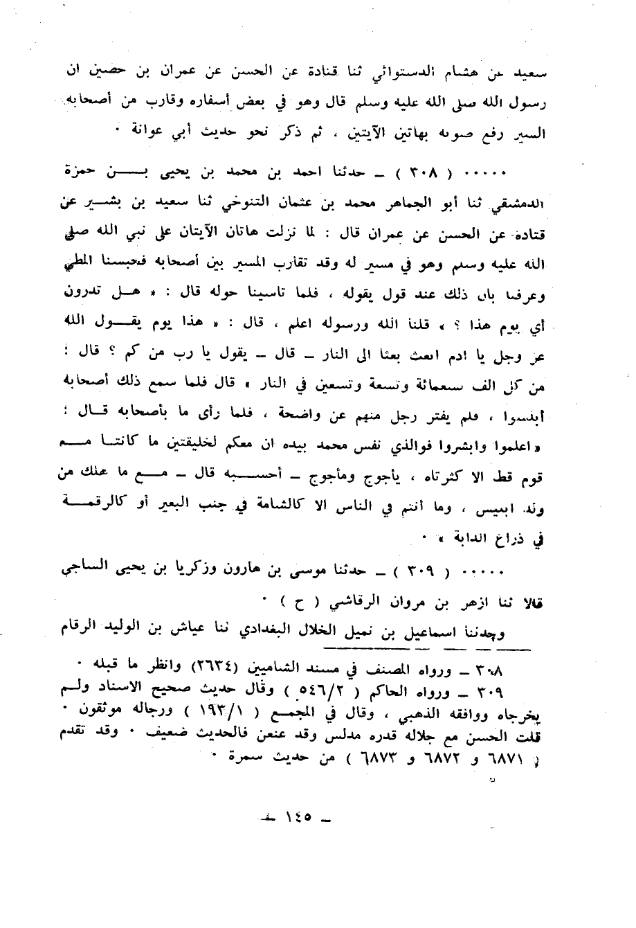 308 - حَدَّثَنَا أَحْمَدُ بْنُ مُحَمَّدِ بْنِ يَحْيَى بْنِ حَمْزَةَ الدِّمَشْقِيُّ، ثنا أَبُو الْجَمَاهِرِ مُحَمَّدُ بْنُ عُثْمَانَ التَّنُّوخِيُّ، ثنا سَعِيدُ بْنُ بَشِيرٍ، عَنْ قَتَادَةَ، عَنِ الْحَسَنِ، عَنْ عِمْرَانَ قَالَ: لَمَّا نَزَلَتْ هَاتَانِ الْآيَتَانِ عَلَى نَبِيِّ اللهِ صَلَّى اللهُ عَلَيْهِ وَسَلَّمَ وَهُوَ فِي مَسِيرٍ لَهُ، وَقَدْ تَقَارَبَ الْمَسِيرَ بَيْنَ أَصْحَابِهِ، فَحَبَسْنَا الْمَطِيَّ وَعَرَفْنَا بِأَنَّ ذَلِكَ عِنْدَ قَوْلٍ يَقُولُهُ فَلَمَّا تَأَسَّيْنَا حَوْلَهُ، قَالَ: «هَلْ تَدْرُونَ أَيُّ يَوْمٍ هَذَا؟» قُلْنَا: اللهُ وَرَسُولُهُ أَعْلَمُ، قَالَ: " هَذَا يَوْمٌ يَقُولُ اللهُ عَزَّ وَجَلَّ: §يَا آدَمُ ابْعَثْ بَعْثًا إِلَى النَّارِ قَالَ: يَقُولُ: يَا رَبِّ مِنْ كَمْ؟ قَالَ: مِنْ كُلِّ أَلْفٍ تِسْعُمِائةٍ وَتِسْعَةٌ وَتِسْعِينَ فِي النَّارِ " قَالَ: فَلَمَّا سَمِعَ ذَلِكَ أَصْحَابُهُ أُبْلِسُوا، فَلَمْ يَفْتُرْ رَجُلٌ مِنْهُمْ عَنْ وَاضِحَةٍ، فَلَمَّا رَأَى مَا بِأَصْحَابِهِ قَالَ: " اعْلَمُوا وَأَبْشِرُوا، فَوَالَّذِي نَفْسُ مُحَمَّدٍ بِيَدِهِ، إِنَّ مَعَكُمْ لَخَلِيقَتَيْنِ مَا كَانَتَا مَعَ قَوْمٍ قَطُّ إِلَّا كَثَّرَتَاهُ يَأْجُوجُ وَمَأْجُوجُ - أَحْسَبُهُ قَالَ: مَعَ مَا هَلَكَ مِنْ وَلَدِ إِبْلِيسَ، وَمَا أَنْتُمْ فِي النَّاسِ إِلَّا كَالشَّامَةِ فِي جَنْبِ الْبَعِيرِ أَوْ كَالرَّقْمَةِ فِي ذِرَاعِ الدَّابَّةِ "