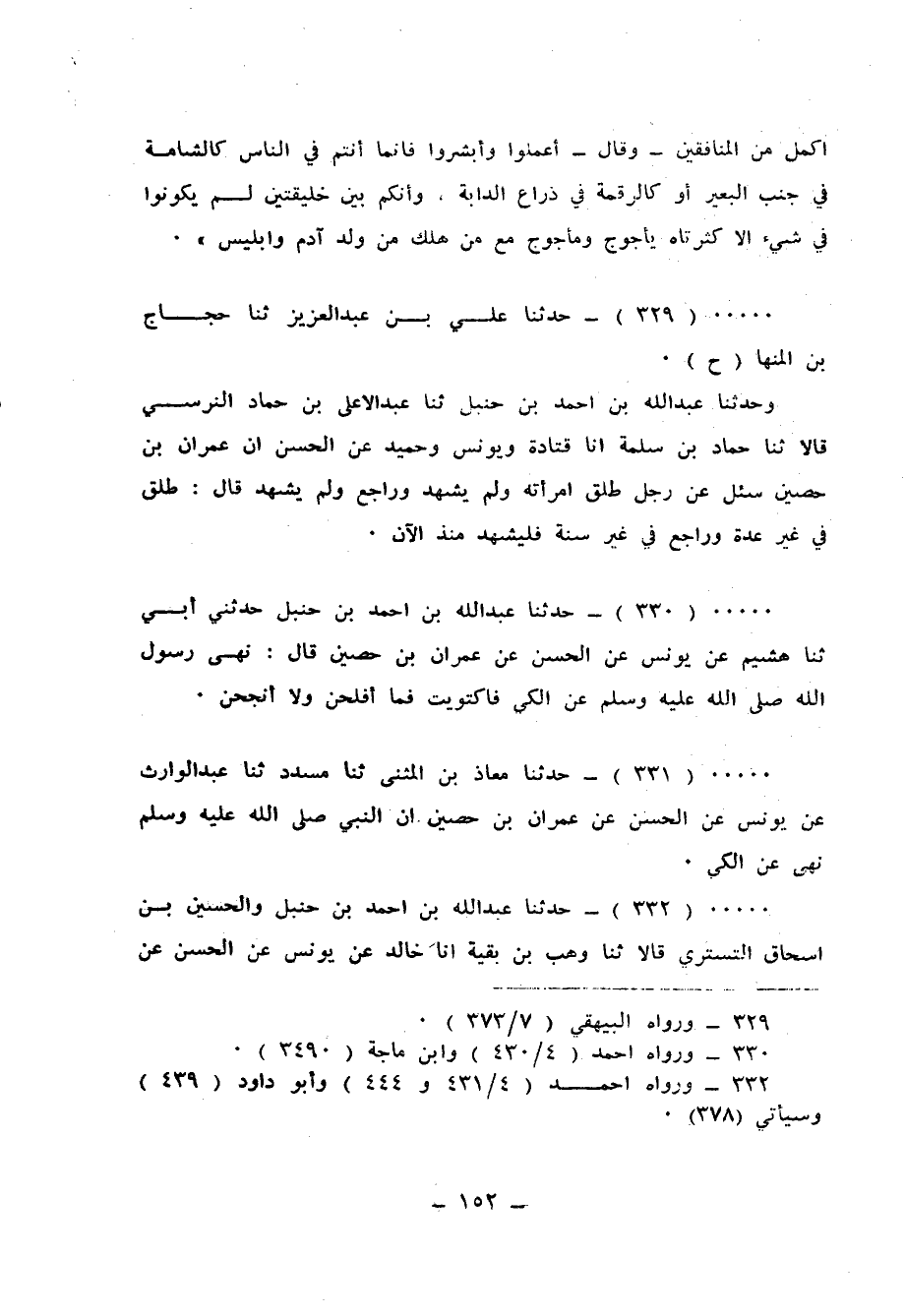329 - حَدَّثَنَا عَلِيُّ بْنُ عَبْدِ الْعَزِيزِ، ثنا حَجَّاجُ بْنُ الْمِنْهَالِ، ح وَحَدَّثَنَا عَبْدُ اللهِ بْنُ أَحْمَدَ بْنِ حَنْبَلٍ، ثنا عَبْدُ الْأَعْلَى بْنُ حَمَّادٍ النَّرْسِيُّ قَالَا: ثنا حَمَّادُ بْنُ سَلَمَةَ، أنا قَتَادَةُ، وَيُونُسُ، وَحُمَيْدٌ، عَنِ الْحَسَنِ، أَنَّ عِمْرَانَ بْنَ حُصَيْنٍ، سُئِلَ عَنْ رَجُلٍ طَلَّقَ امْرَأَتَهُ، وَلَمْ يُشْهِدْ، وَرَاجَعَ وَلَمْ يُشْهِدْ؟ قَالَ: «§طَلَّقَ فِي غَيْرِ عِدَّةٍ، وَرَاجَعَ فِي غَيْرِ سُّنَّةٍ فَلْيُشْهِدْ مُنْذُ الْآنَ»