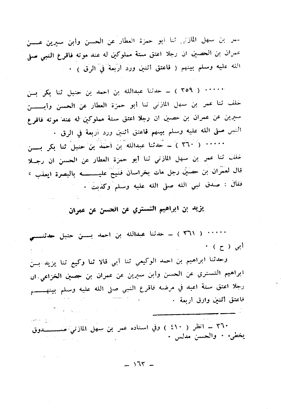 359 - حَدَّثَنَا عَبْدُ اللهِ بْنُ أَحْمَدَ بْنِ حَنْبَلٍ، ثنا بَكْرُ بْنُ خَلَفٍ، ثنا عُمَرُ بْنُ سَهْلٍ الْمَازِنِيُّ، ثنا أَبُو حَمْزَةَ الْعَطَّارُ، عَنِ الْحَسَنِ، وَابْنِ سِيرِينَ، عَنْ عِمْرَانَ بْنِ حُصَيْنٍ، أَنَّ §رَجُلًا، أَعْتَقَ سِتَّةَ مَمْلُوكِينَ لَهُ عِنْدَ مَوْتِهِ، «فَأَقْرَعَ النَّبِيُّ صَلَّى اللهُ عَلَيْهِ وَسَلَّمَ بَيْنَهُمْ، فَأَعْتَقَ اثْنَيْنِ، وَرَدَّ أَرْبَعَةً فِي الرِّقِّ»