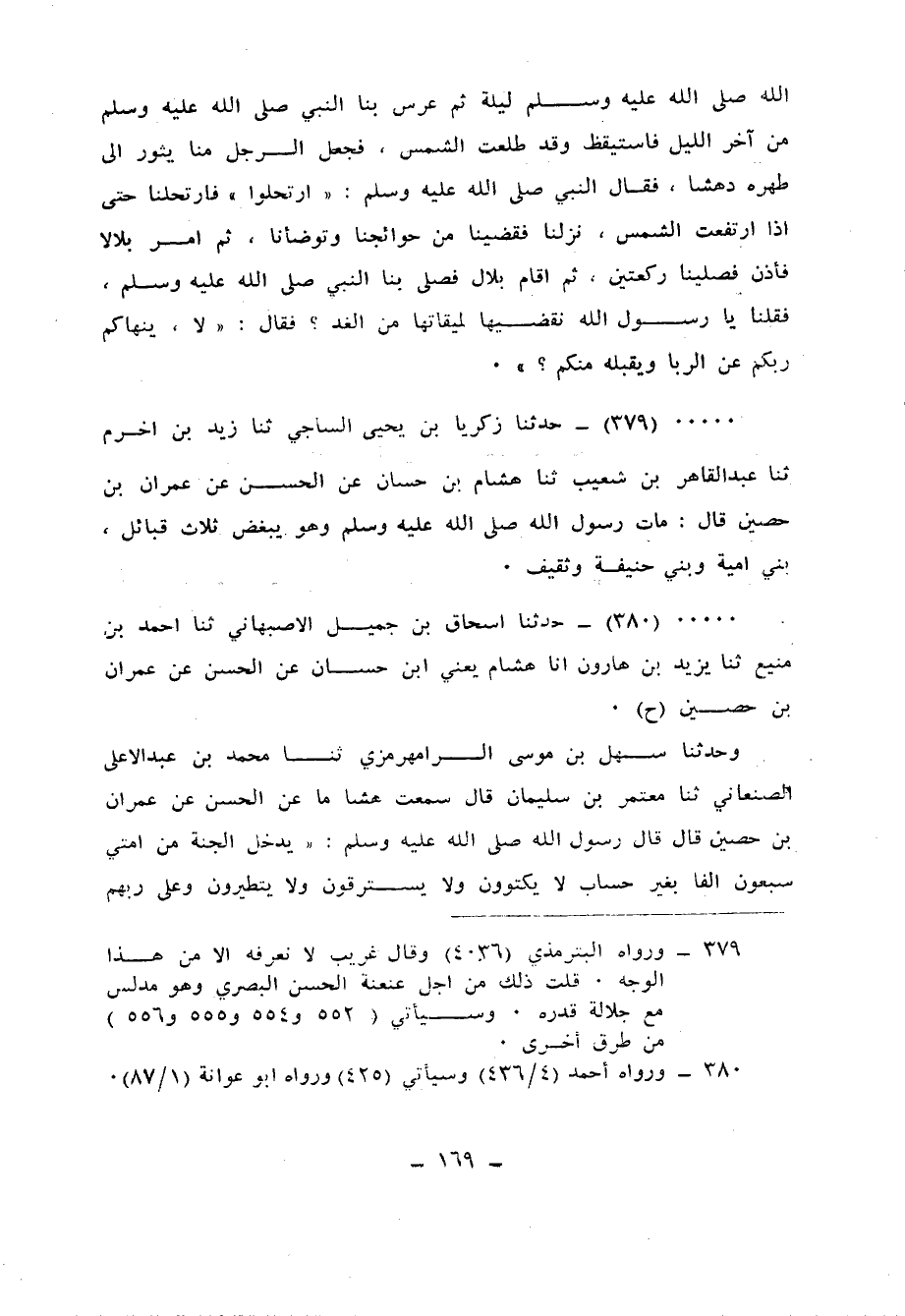 380 - حَدَّثَنَا إِسْحَاقُ بْنُ جَمِيلٍ الْأَصْبَهَانِيُّ، ثنا أَحْمَدُ بْنُ مَنِيعٍ، ثنا يَزِيدُ بْنُ هَارُونَ، أنا هِشَامٌ يَعْنِي بْنَ حَسَّانَ، عَنِ الْحَسَنِ، عَنْ عِمْرَانَ بْنِ حُصَيْنٍ، ح وَحَدَّثَنَا سَهْلُ بْنُ مُوسَى الرَّامَهُرْمُزِيُّ، ثنا مُحَمَّدُ بْنُ عَبْدِ الْأَعْلَى الصَّنْعَانِيُّ، ثنا مُعْتَمِرُ بْنُ سُلَيْمَانَ قَالَ: سَمِعْتُ هِشَامًا، عَنِ الْحَسَنِ، عَنْ عِمْرَانَ بْنِ حُصَيْنٍ قَالَ: قَالَ رَسُولُ اللهِ صَلَّى اللهُ عَلَيْهِ وَسَلَّمَ: «§يَدْخُلُ الْجَنَّةَ مِنْ أُمَّتِي سَبْعُونَ أَلْفًا بِغَيْرِ حِسَابٍ، لَا يَكْتَوُونَ، وَلَا يَسْتَرْقُونَ، وَلَا يَتَطَيَّرُونَ، وَعَلَى رَبِّهِمْ يَتَوَكَّلُونَ» فَقَامَ عُكَّاشَةُ بْنُ مِحْصَنٍ فَقَالَ: يَا رَسُولَ اللهِ، ادْعُ اللهَ أَنْ يَجْعَلَنِي مِنْهُمْ، قَالَ: «اللهُمَّ اجْعَلْهُ مِنْهُمْ» ، فَقَامَ رَجُلٌ آخَرُ فَقَالَ: يَا رَسُولَ اللهِ، ادْعُ اللهَ أَنْ يَجْعَلَنِي مِنْهُمْ فَقَالَ: «سَبَقَكَ بِهَا عُكَّاشَةُ»