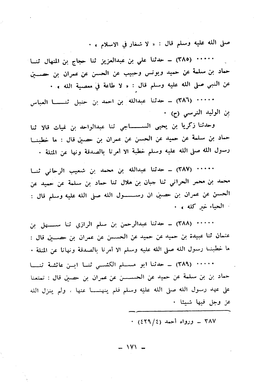 386 - حَدَّثَنَا عَبْدُ اللهِ بْنُ أَحْمَدَ بْنِ حَنْبَلٍ، ثنا الْعَبَّاسُ بْنُ الْوَلِيدِ النَّرْسِيُّ، ح وَحَدَّثَنَا زَكَرِيَّا بْنُ يَحْيَى السَّاجِيُّ، ثنا عَبْدُ الْوَاحِدِ بْنُ غِيَاثٍ، قَالَا: ثنا حَمَّادُ بْنُ سَلَمَةَ، عَنْ حُمَيْدٍ، عَنِ الْحَسَنِ، عَنْ عِمْرَانَ بْنِ حُصَيْنٍ قَالَ: «§مَا خَطَبَنَا رَسُولُ اللهِ صَلَّى اللهُ عَلَيْهِ وَسَلَّمَ خِطْبَةً إِلَّا أَمَرَنَا بِالصَّدَقَةِ، وَنَهَى عَنِ الْمُثْلَةِ»