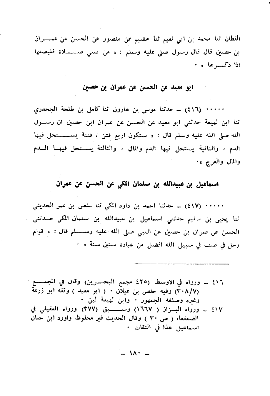 416 - حَدَّثَنَا مُوسَى بْنُ هَارُونَ، ثنا كَامِلُ بْنُ طَلْحَةَ الْجَحْدَرِيُّ، ثنا ابْنُ لَهِيعَةَ، حَدَّثَنِي أَبُو مَعْبَدٍ، عَنِ الْحَسَنِ، عَنْ عِمْرَانَ بْنِ حُصَيْنٍ، أَنَّ رَسُولَ اللهِ صَلَّى اللهُ عَلَيْهِ وَسَلَّمَ قَالَ: " §سَتَكُونُ أَرْبَعُ فِتَنٍ: فِتْنَةٌ يُسْتَحَلُّ فِيهَا الدَّمُ، وَالثَّانِيَةُ يُسْتَحَلُّ فِيهَا الدَّمُ وَالْمَالُ، وَالثَّالِثَةُ يُسْتَحَلُّ فِيهَا الدَّمُ وَالْمَالُ وَالْفَرْجُ "