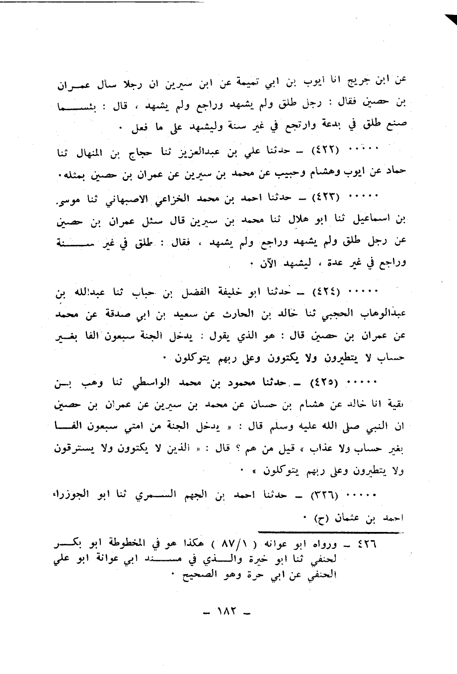 426 - حَدَّثَنَا أَحْمَدُ بْنُ الْجَهْمِ السَّمُرِيُّ، ثنا أَبُو الْجَوْزَاءِ أَحْمَدُ بْنُ عُثْمَانَ، ح، وَحَدَّثَنَا عَبْدَانُ بْنُ أَحْمَدَ، ثنا سُلَيْمَانُ بْنُ عَبْدِ الْجَبَّارِ قَالَا: ثنا أَبُو بَكْرٍ الْحَنَفِيُّ، ثنا أَبُو حُرَّةَ، عَنْ مُحَمَّدِ بْنِ سِيرِينَ، ثنا عِمْرَانُ بْنُ حُصَيْنٍ قَالَ: قَالَ رَسُولُ اللهِ صَلَّى اللهُ عَلَيْهِ وَسَلَّمَ: «§يَدْخُلُ الْجَنَّةَ مِنْ أُمَّتِي سَبْعُونَ أَلْفًا بِغَيْرِ حِسَابٍ، لَا يَكْتَوُونَ، وَلَا يَسْتَرْقُونَ، وَلَا يَتَطَيَّرُونَ وَعَلَى رَبِّهِمْ يَتَوَكَّلُونَ» قَالَ عِمْرَانُ: «فَقَدِ اكْتَوَيْنَا فَمَا أَفْلَحْنَ وَلَا أَنْجَحْنَ»