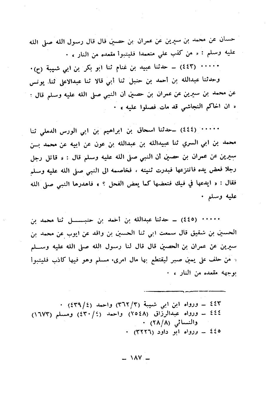 445 - حَدَّثَنَا عَبْدُ اللهِ بْنُ أَحْمَدَ بْنِ حَنْبَلٍ، ثنا مُحَمَّدُ بْنُ الْحُسَيْنِ بْنِ شَقِيقٍ قَالَ: سَمِعْتُ أَبِي، ثنا الْحُسَيْنُ بْنُ وَاقِدٍ، عَنْ أَيُّوبَ، عَنْ مُحَمَّدِ بْنِ سِيرِينَ، عَنْ عِمْرَانَ بْنِ الْحُصَيْنِ قَالَ: قَالَ لَنَا رَسُولُ اللهِ صَلَّى اللهُ عَلَيْهِ وَسَلَّمَ: «§مَنْ حَلَفَ عَلَى يَمِينٍ صَبْرٍ لِيَقْتَطِعَ بِهَا مَالَ امْرِئٍ مُسْلِمٍ وَهُوَ فِيهَا كَاذِبٌ فَلْيَتَبَوَّأْ بِوَجْهِهِ مَقْعَدَهُ مِنَ النَّارِ»