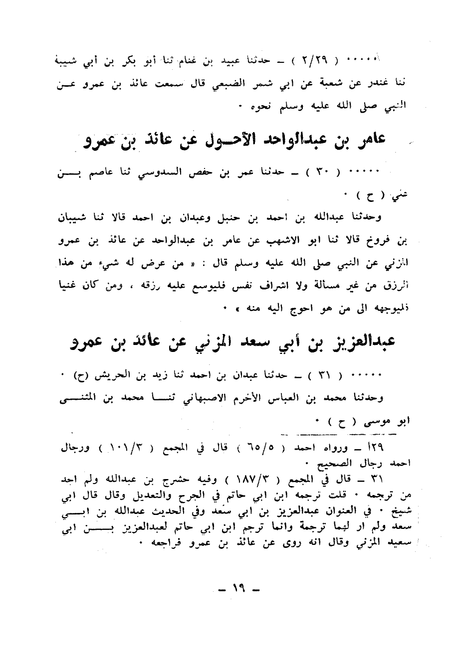30 - حَدَّثَنَا عُمَرُ بْنُ حَفْصٍ السَّدُوسِيُّ، ثنا عَاصِمُ بْنُ عَلِيٍّ، ح وَحَدَّثَنَا عَبْدُ اللهِ بْنُ أَحْمَدَ بْنِ حَنْبَلٍ، وَعَبْدَانُ بْنُ أَحْمَدَ، قَالَا: ثنا شَيْبَانُ بْنُ فَرُّوخَ، قَالَا: ثنا أَبُو الْأَشْهَبِ، عَنْ عَامِرِ بْنِ عَبْدِ الْوَاحِدِ، عَنْ عَائِذِ بْنِ عَمْرٍو الْمُزَنِيِّ، عَنِ النَّبِيِّ صَلَّى اللهُ عَلَيْهِ وَسَلَّمَ قَالَ: «§مَنْ عُرِضَ لَهُ شَيْءٌ مِنْ هَذَا الرِّزْقِ مِنْ غَيْرِ مَسْأَلَةٍ، وَلَا إِشْرَافِ نَفْسٍ فَلْيُوَسِّعْ عَلَيْهِ رِزْقَهُ، وَمَنْ كَانَ غَنِيًّا فَلْيُوَجِّهْهُ إِلَى مَنْ هُوَ أَحْوَجُ إِلَيْهِ مِنْهُ»