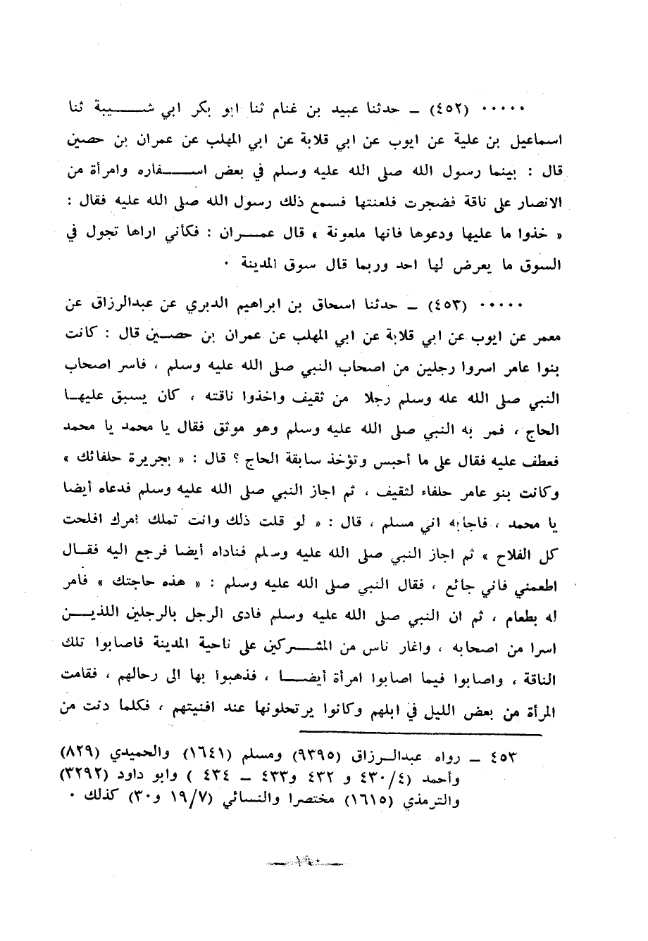 453 - حَدَّثَنَا إِسْحَاقُ بْنُ إِبْرَاهِيمَ الدَّبَرِيُّ، عَنْ عَبْدِ الرَّزَّاقِ، عَنْ مَعْمَرٍ، عَنْ أَيُّوبَ، عَنْ أَبِي قِلَابَةَ، عَنْ أَبِي الْمُهَلَّبِ، عَنْ عِمْرَانَ بْنِ حُصَيْنٍ قَالَ: كَانَتْ بَنُو عَامِرٍ أَسَرُوا رَجُلَيْنِ مِنْ أَصْحَابِ النَّبِيِّ صَلَّى اللهُ عَلَيْهِ وَسَلَّمَ، فَأَسَرَ أَصْحَابُ النَّبِيِّ صَلَّى اللهُ عَلَيْهِ وَسَلَّمَ رَجُلًا مِنْ ثَقِيفٍ، وَأَخَذُوا نَاقَتَهُ كَانَ يَسْبِقُ عَلَيْهَا الْحَاجَّ، فَمَرَّ بِهِ النَّبِيُّ صَلَّى اللهُ عَلَيْهِ وَسَلَّمَ وَهُوَ مُوَثَّقٌ فَقَالَ: يَا مُحَمَّدُ، يَا مُحَمَّدُ، فَعَطَفَ عَلَيْهِ، فَقَالَ: عَلَى مَا أُحْبَسُ وَتُؤْخَذُ سَابِقَةَ الْحَاجِّ؟ قَالَ: «بِجَرِيرَةِ حُلَفَائِكَ» وَكَانَتْ بَنُو عَامِرٍ حُلَفَاءَ لِثَقِيفٍ، ثُمَّ أَجَازَ النَّبِيُّ صَلَّى اللهُ عَلَيْهِ وَسَلَّمَ، فَدَعَاهُ أَيْضًا: يَا مُحَمَّدُ فَأَجَابَهُ: إِنِّي مُسْلِمٌ قَالَ: «لَوْ قُلْتَ ذَلِكَ وَأَنْتَ تَمْلِكُ أَمْرَكَ أَفْلَحْتَ كُلَّ الْفَلَاحِ» ثُمَّ أَجَازَ النَّبِيُّ صَلَّى اللهُ عَلَيْهِ وَسَلَّمَ فَنَادَاهُ أَيْضًا، فَرَجَعَ إِلَيْهِ فَقَالَ: أَطْعِمْنِي فَإِنِّي جَائِعٌ، فَقَالَ النَّبِيُّ صَلَّى اللهُ عَلَيْهِ وَسَلَّمَ: «هَذِهِ حَاجَتُكَ» ، فَأَمَرَ لَهُ بِطَعَامٍ، ثُمَّ إِنَّ النَّبِيَّ صَلَّى اللهُ عَلَيْهِ وَسَلَّمَ فَادَى الرَّجُلُ بِالرَّجُلَيْنِ اللَّذَيْنِ أُسِرَا مِنْ أَصْحَابِهِ، وَأَغَارَ نَاسٌ مِنَ الْمُشْرِكِينَ عَلَى نَاحِيَةِ الْمَدِينَةِ، فَأَصَابُوا تِلْكَ النَّاقَةِ، وَأَصَابُوا فِيمَا أَصَابُوا امْرَأَةً أَيْضًا، فَذَهَبُوا بِهَا إِلَى رِحَالِهِمْ، فَقَامَتِ الْمَرْأَةُ مِنْ بَعْضِ اللَّيْلِ فِي إِبِلِهِمْ، وَكَانُوا يَرْتَحِلُونَهَا عِنْدَ أَفْنِيَتِهِمْ، فَكُلَّمَا دَنَتْ مِنْ بَعِيرٍ لِتَرْكَبَهُ رَغَا فَتَرَكَتْهُ حَتَّى جَاءَتْ إِلَى نَاقَةِ رَسُولِ اللهِ صَلَّى اللهُ عَلَيْهِ وَسَلَّمَ وَهِيَ نَاقَةٌ ذَلُولٌ، فَلَمْ تَرْغُ حَتَّى قَعَدَتْ فِي عَجُزِهَا، ثُمَّ صَاحَتْ بِهَا، وَنَدَرَ بِهَا الْقَوْمُ، فَرَكِبُوا فِي طَلَبِهَا، فَنَذَرَتْ - وَهِيَ مُنْطَلِقَةٌ وَهِيَ فِي أَثَرِهَا إِنِ اللهُ أَنْجَاهَا عَلَيْهَا أَنْ تَنْحَرَهَا، فَنَجَتْ، فَلَمَّا قَدِمَتِ الْمَدِينَةَ أُتِيَ النَّبِيُّ صَلَّى اللهُ عَلَيْهِ وَسَلَّمَ فَقِيلَ: هَذِهِ نَاقَتُكَ جَاءَتْ بِهَا فُلَانَةُ نَجَّاهَا اللهُ عَلَيْهَا مِنَ الْمُشْرِكِينَ، فَأُتِيَ النَّبِيُّ صَلَّى اللهُ عَلَيْهِ وَسَلَّمَ بِالْمَرْأَةِ وَالنَّاقَةِ فَسَأَلَهَا: «كَيْفَ صَنَعْتِ؟» فَأَخْبَرَتْهُ قَالَتْ: وَنَذَرَتُ وَهُمْ فِي طَلَبِي عَلَيْهَا أَنْ أَنْحَرَهَا، فَقَالَ النَّبِيُّ صَلَّى اللهُ عَلَيْهِ وَسَلَّمَ: «بِئْسَ مَا جَازَيْتِهَا إِذًا، §لَا وَفَاءَ لِنَذْرٍ فِي مَعْصِيَةٍ وَلَا فِيمَا لَا يَمْلِكُ ابْنُ آدَمَ»