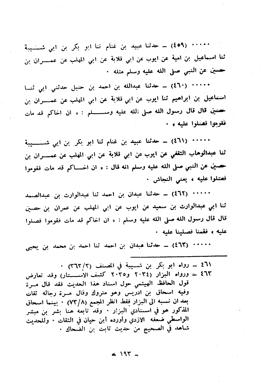 460 - حَدَّثَنَا عَبْدُ اللهِ بْنُ أَحْمَدَ بْنِ حَنْبَلٍ، حَدَّثَنِي أَبِي، ثنا إِسْمَاعِيلُ بْنُ إِبْرَاهِيمَ، ثنا أَيُّوبُ، عَنْ أَبِي قِلَابَةَ، عَنْ أَبِي الْمُهَلَّبِ، عَنْ عِمْرَانَ بْنِ حُصَيْنٍ قَالَ: قَالَ رَسُولُ اللهِ صَلَّى اللهُ عَلَيْهِ وَسَلَّمَ: «إِنَّ §أَخَاكُمْ قَدْ مَاتَ فَقُومُوا فَصَلُّوا عَلَيْهِ»