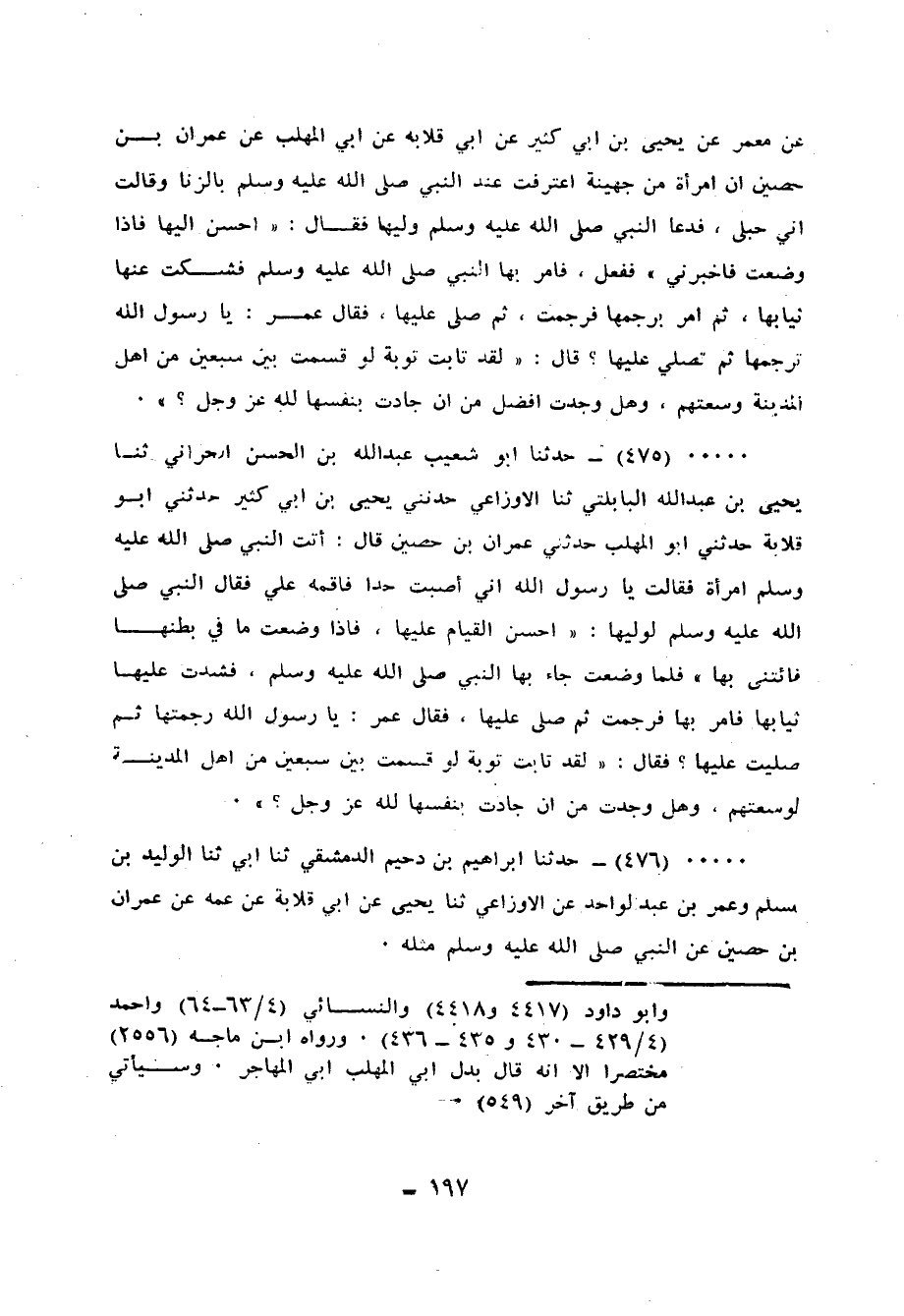 475 - حَدَّثَنَا أَبُو شُعَيْبٍ عَبْدُ اللهِ بْنُ الْحَسَنِ الْحَرَّانِيُّ، ثنا يَحْيَى بْنُ عَبْدِ اللهِ الْبَابُلُتِّيُّ، ثنا الْأَوْزَاعِيُّ، حَدَّثَنِي يَحْيَى بْنُ أَبِي كَثِيرٍ، حَدَّثَنِي أَبُو قِلَابَةَ، حَدَّثَنِي أَبُو الْمُهَلَّبِ، حَدَّثَنِي عِمْرَانُ بْنُ حُصَيْنٍ قَالَ: أَتَتِ النَّبِيَّ صَلَّى اللهُ عَلَيْهِ وَسَلَّمَ امْرَأَةٌ فَقَالَتْ: يَا رَسُولَ اللهِ إِنِّي أَصَبْتُ حَدًّا فَأَقِمْهُ عَلَيَّ، فَقَالَ النَّبِيُّ صَلَّى اللهُ عَلَيْهِ وَسَلَّمَ لِوَلِيِّهَا: «أَحْسِنِ الْقِيَامَ عَلَيْهَا، فَإِذَا وَضَعَتْ مَا فِي بَطْنِهَا فَائْتِنِي بِهَا» فَلَمَّا وَضَعَتْ جَاءَ بِهَا النَّبِيَّ صَلَّى اللهُ عَلَيْهِ وَسَلَّمَ، فَشُدَّتْ عَلَيْهَا ثِيَابُهَا، فَأَمَرَ بِهَا، فَرُجِمَتْ، ثُمَّ صَلَّى عَلَيْهَا فَقَالَ عُمَرُ: يَا رَسُولَ اللهِ، رَجَمْتَهَا ثُمَّ صَلَّيْتَ عَلَيْهَا؟ فَقَالَ: «§لَقَدْ تَابَتْ تَوْبَةً لَوْ قُسِمَتْ بَيْنَ سَبْعِينَ مِنْ أَهْلِ الْمَدِينَةِ لَوَسِعَتْهُمْ، وَهَلْ وَجَدْتَ مِنْ أَنْ جَادَتْ بِنَفْسِهَا لِلَّهِ عَزَّ وَجَلَّ»