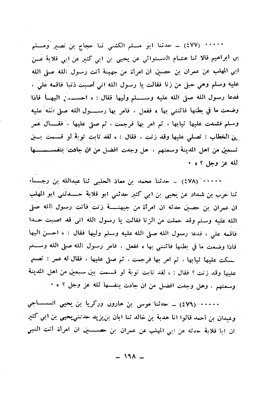 479 - حَدَّثَنَا مُوسَى بْنُ هَارُونَ، وَزَكَرِيَّا بْنُ يَحْيَى السَّاجِيُّ، وَعَبْدَانُ بْنُ أَحْمَدَ قَالُوا: أنا هُدْبَةُ بْنُ خَالِدٍ، ثنا أَبَانُ بْنُ يَزِيدَ، حَدَّثَنِي يَحْيَى بْنُ أَبِي كَثِيرٍ، أَنَّ أَبَا قِلَابَةَ، حَدَّثَهُ، عَنْ أَبِي الْمُهَلَّبِ، عَنْ عِمْرَانَ بْنِ حُصَيْنٍ، أَنَّ امْرَأَةً أَتَتِ النَّبِيَّ صَلَّى اللهُ عَلَيْهِ وَسَلَّمَ فَقَالَتْ: إِنِّي أَصَبْتُ حَدًّا فَأَقِمْهُ عَلِيَّ وَهِيَ حَامِلٌ، فَأَمَرَ وَلِيَّهَا أَنْ يُحْسِنَ إِلَيْهَا حَتَّى تَضَعَ، فَلَمَّا وَضَعَتْ، أَمَرَ بِثِيَابِهَا، فَشُكَّتَ عَلَيْهَا، ثُمَّ رَجَمَهَا، وَصَلَّى عَلَيْهَا، فَقَالَ عُمَرُ: يَا نَبِيَّ اللهِ، أَتُصَلِّي عَلَيْهَا وَقَدْ زَنَتْ؟ فَقَالَ: «وَالَّذِي نَفْسُ مُحَمَّدٍ بِيَدِهِ لَقَدْ §تَابَتْ تَوْبَةً لَوْ قُسِمَتْ عَلَى سَبْعِينَ مِنْ أَهْلِ الْمَدِينَةِ لَوَسِعَتْهُمْ، وَهَلْ وَجَدْتَ أَفْضَلَ مِنْ أَنْ جَادَتْ بِنَفْسِهَا لِلَّهِ عَزَّ وَجَلَّ»