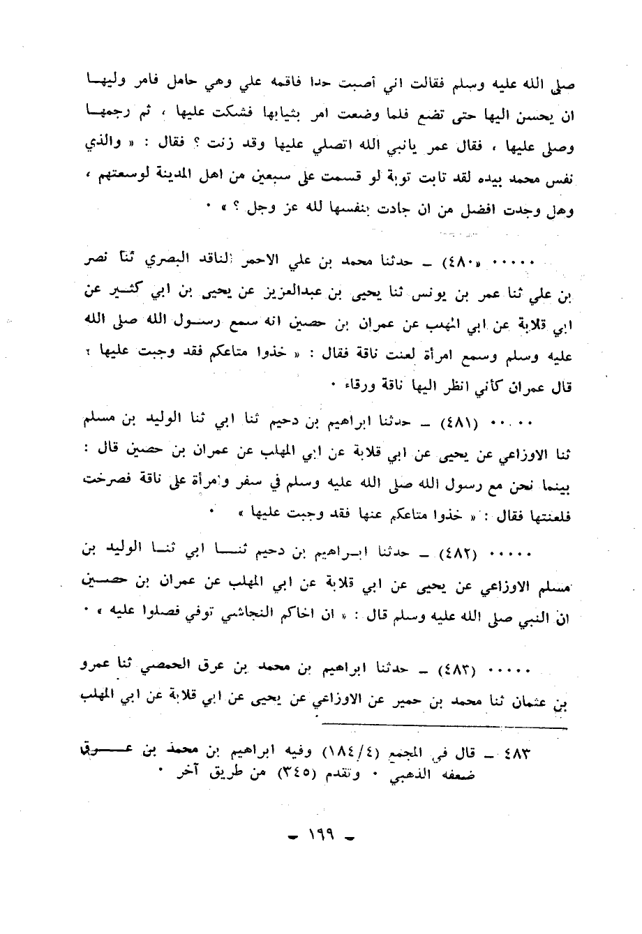 481 - حَدَّثَنَا إِبْرَاهِيمُ بْنُ دُحَيْمٍ، ثنا أَبِي، ثنا الْوَلِيدُ بْنُ مُسْلِمٍ، ثنا الْأَوْزَاعِيُّ، عَنْ يَحْيَى، عَنْ أَبِي قِلَابَةَ، عَنْ أَبِي الْمُهَلَّبِ، عَنْ عِمْرَانَ بْنِ حُصَيْنٍ قَالَ: بَيْنَمَا نَحْنُ مَعَ رَسُولِ اللهِ صَلَّى اللهُ عَلَيْهِ وَسَلَّمَ فِي سَفَرٍ وَامْرَأَةٌ عَلَى نَاقَةٍ فَصَرَخَتْ فَلَعَنَتْهَا فَقَالَ: «§خُذُوا مَتَاعَكُمْ عَنْهَا فَقَدْ وَجَبَتْ عَلَيْهَا»
