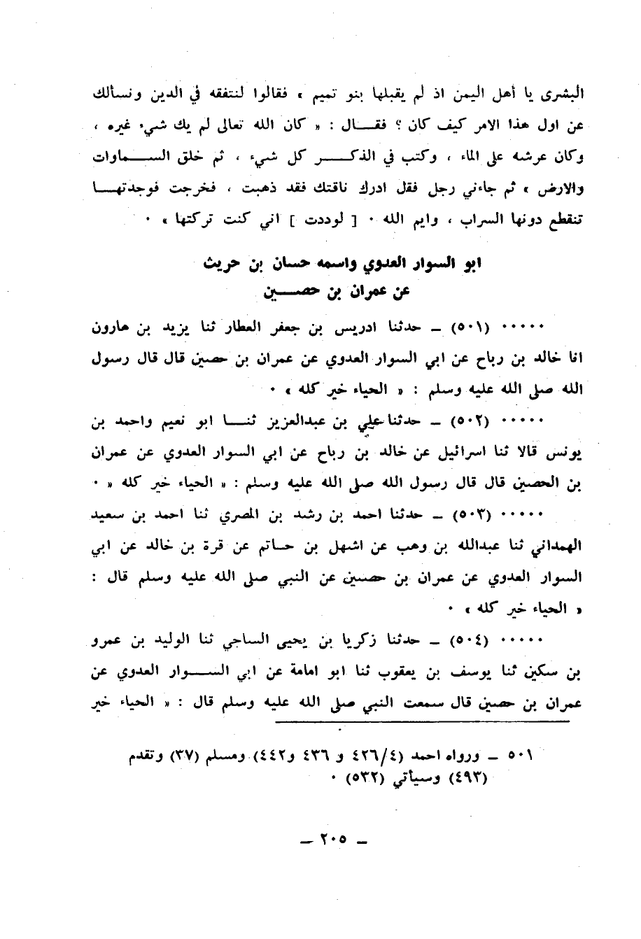 501 - حَدَّثَنَا إِدْرِيسُ بْنُ جَعْفَرٍ الْعَطَّارُ، ثنا يَزِيدُ بْنُ هَارُونَ، أَنَا خَالِدُ بْنُ رَبَاحٍ، عَنْ أَبِي السَّوَّارِ الْعَدَوِيِّ، عَنْ عِمْرَانَ بْنِ حُصَيْنٍ قَالَ: قَالَ رَسُولُ اللهِ صَلَّى اللهُ عَلَيْهِ وَسَلَّمَ: «§الْحَيَاءُ خَيْرٌ كُلُّهُ»
