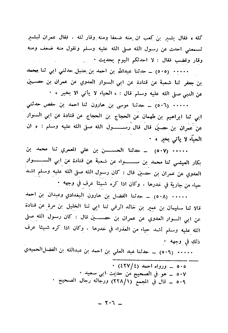 505 - حَدَّثَنَا عَبْدُ اللهِ بْنُ أَحْمَدَ بْنِ حَنْبَلٍ، حَدَّثَنِي أَبِي، ثنا مُحَمَّدُ بْنُ جَعْفَرٍ، ثنا شُعْبَةُ، عَنْ قَتَادَةَ، عَنْ أَبِي السَّوَّارِ الْعَدَوِيِّ، عَنْ عِمْرَانَ بْنِ حُصَيْنٍ، عَنِ النَّبِيِّ صَلَّى اللهُ عَلَيْهِ وَسَلَّمَ قَالَ: «§الْحَيَاءُ لَا يَأْتِي إِلَّا بِخَيْرٍ»