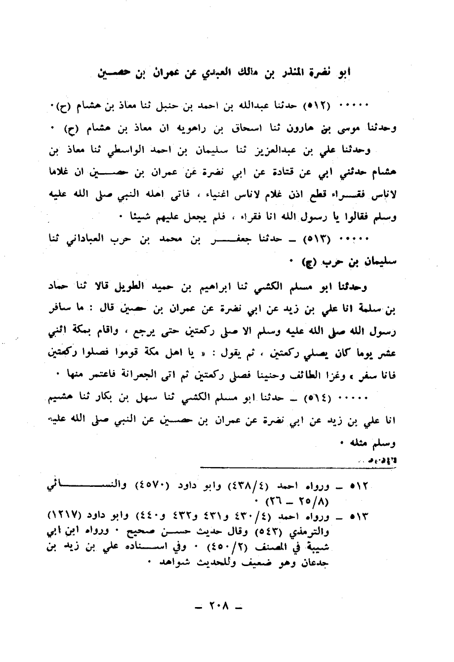 513 - حَدَّثَنَا جَعْفَرُ بْنُ مُحَمَّدِ بْنِ حَرْبٍ الْعَبَّادَانِيُّ، ثنا سُلَيْمَانُ بْنُ حَرْبٍ، ح وَحَدَّثَنَا أَبُو مُسْلِمٍ الْكَشِّيُّ، ثنا إِبْرَاهِيمُ بْنُ حُمَيْدٍ الطَّوِيلُ، قَالَا: ثنا حَمَّادُ بْنُ سَلَمَةَ، أَنَا عَلِيُّ بْنُ زَيْدٍ، عَنْ أَبِي نَضْرَةَ، عَنْ عِمْرَانَ بْنِ حُصَيْنٍ قَالَ: " مَا سَافَرَ رَسُولُ اللهِ صَلَّى اللهُ عَلَيْهِ وَسَلَّمَ إِلَّا صَلَّى رَكْعَتَيْنِ حَتَّى يَرْجِعَ، وَأَقَامَ بِمَكَّةَ اثْنَيْ عَشَرَ يَوْمًا، كَانَ يُصَلِّي رَكْعَتَيْنِ ثُمَّ يَقُولُ: «يَا أَهْلَ مَكَّةَ §قُومُوا فَصَلُّوا رَكْعَتَيْنِ فَأَنَا سَفْرٌ» ، وَغَزَا الطَّائِفَ وَحَنِينًا فَصَلَّى رَكْعَتَيْنِ، ثُمَّ أَتَى الْجِعِرَّانَةَ فَاعْتَمَرَ مِنْهَا