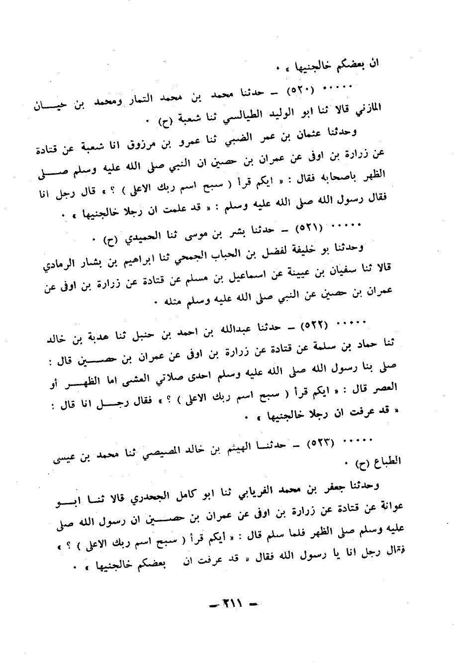 521 - حَدَّثَنَا بِشْرُ بْنُ مُوسَى، ثنا الْحُمَيْدِيُّ، ح وَحَدَّثَنَا أَبُو خَلِيفَةَ الْفَضْلُ بْنُ الْحُبَابِ الْجُمَحِيُّ، ثنا إِبْرَاهِيمُ بْنُ بَشَّارٍ الرَّمَادِيُّ قَالَا: ثنا سُفْيَانُ بْنُ عُيَيْنَةَ، عَنْ إِسْمَاعِيلَ بْنِ مُسْلِمٍ، عَنْ قَتَادَةَ، عَنْ زُرَارَةَ بْنِ أَوْفَى، عَنْ عِمْرَانَ بْنِ حُصَيْنٍ، عَنِ النَّبِيِّ صَلَّى اللهُ عَلَيْهِ وَسَلَّمَ مِثْلَهُ